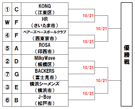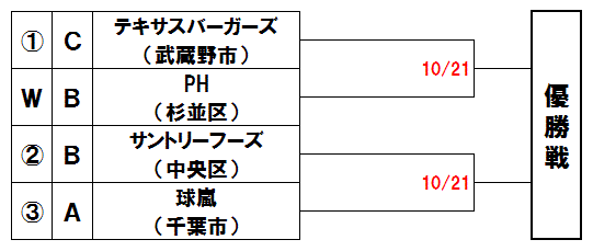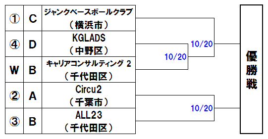 | 上段は打力のあるTactics(墨田区)を紫光倶楽部(横浜市)が、下段は実戦経験豊富なAYB(さいたま市)を蔵(江東区)が追う展開か。 |
