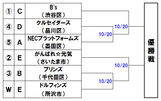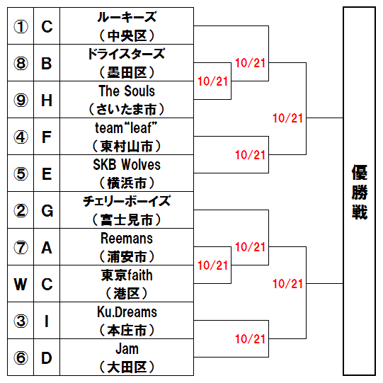 | 例年と同じく飛び抜けたチームがなく、混戦が予想される。上段はLIGHTNING-BOLT(所沢市)が勝ち抜けると見た。下段は鉄人Blue Devils(新宿区)と京都サスペンス(文京区)の勝者の勝ち上がりが有力。 |