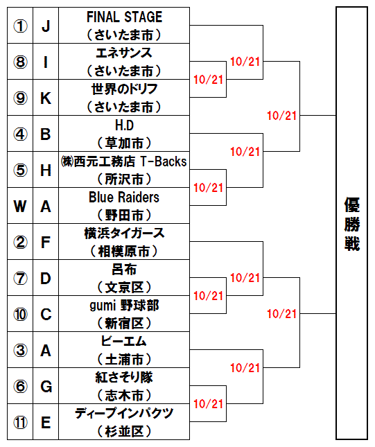 | 上段はここも混戦模様。FAINAL STAGE(さいたま市)とBlue Raiders(野田市)が勝ち上がり決戦か。下段はビーエム(土浦市)が有力。 |