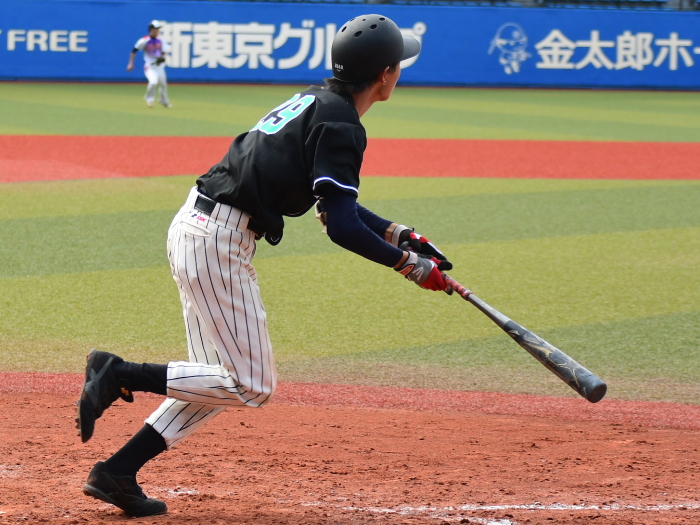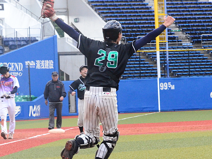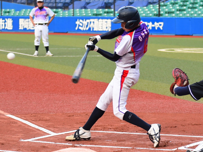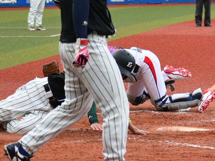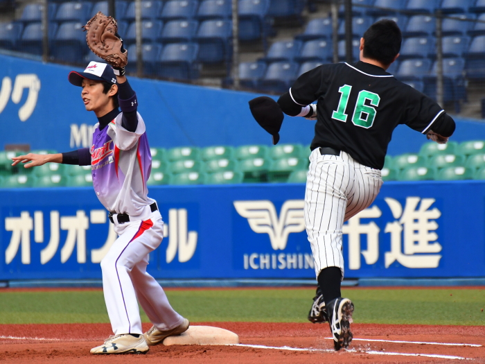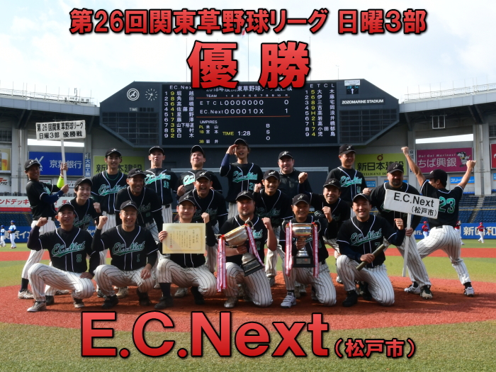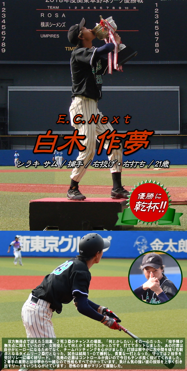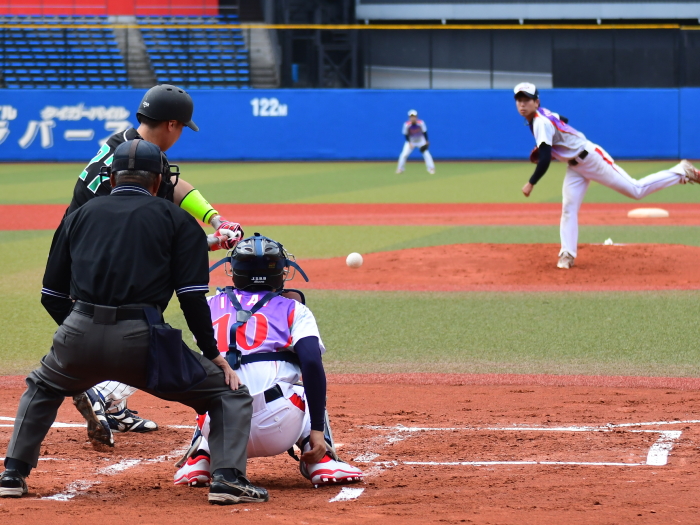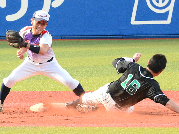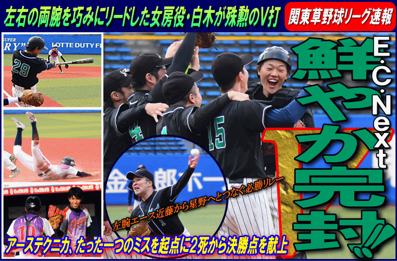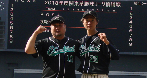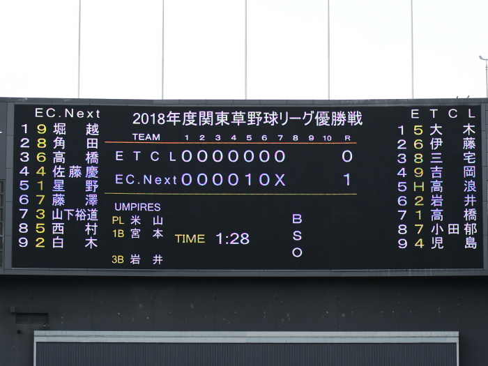 | たった1つのミスが明暗を分けた。最初にチャンスを作ったのはE.C.Next。2回、この回先頭の4番佐藤が3塁打で出塁するが、ここはアーステクニカ先発・高橋が後続を連続三振と内野ゴロに仕留め無得点に終わる。E.C.Nextは続く3回にも先頭が四球を選び出塁するが、2盗失敗で得点には至らない。一方のアーステクニカも3回には1死2塁、5回には初ヒットで7番高橋が出塁するも攻めきれず、スコアボードには双方0が刻まれていく。そんな中、重い均衡が破れたのは5回。E.C.Nextは相手エラーで出たランナーを2死ながら3塁に置き、ここで9番白木が鮮やかに右中間を破るタイムリー2ベース。待望の1点をもぎ取った。追うアーステクニカも最終回に2死から再び高橋が2塁打で出塁し一打同点の場面を作るが、最後のバッターが倒れゲームセット。E.C.Nextが虎の子の1点を守り切った。 |