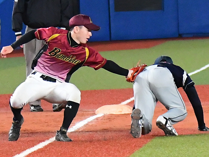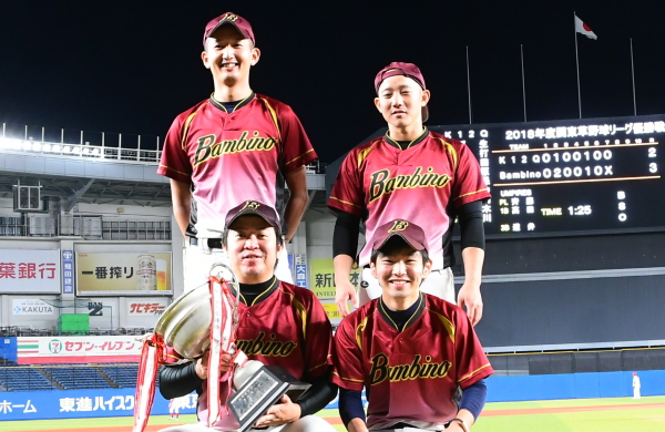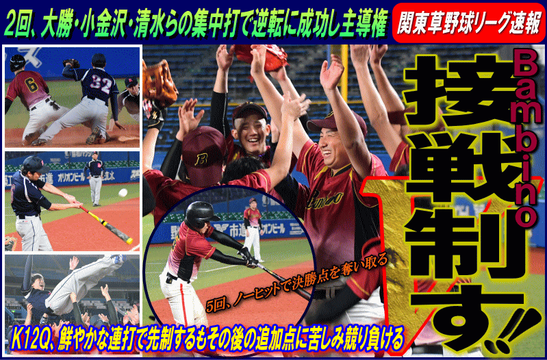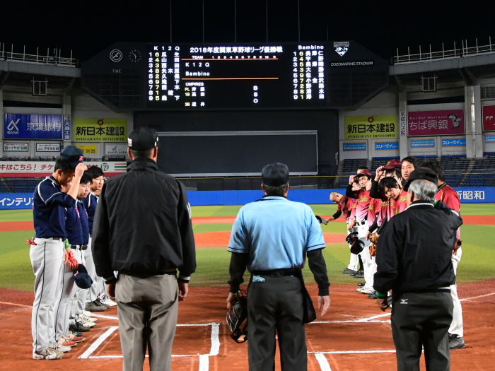 | K12Qは2回、先頭の5番久保が3ベースで出塁すると続く6番滝下がセンターへ弾き返し、見事な連打で1点を先制。Bambinoもその裏すぐさま反撃。先頭の4番大勝のヒットと進塁打で1死2塁とすると、6番小金沢がレフトへタイムリー2ベースを放ちまず同点。さらに2死後、8番清水がライトへタイムリーを放ち2点目。この回3本のヒットを固める集中打を浴びせ、一気に逆転に成功した。追うK12Qは5回、内野ゴロの間に同点とするが、その裏Bambinoも四球で出たランナーを得点圏に進めると、相手エラーでランナーが生還。結局これが決勝点となり、Bambinoが接戦を制した。 |