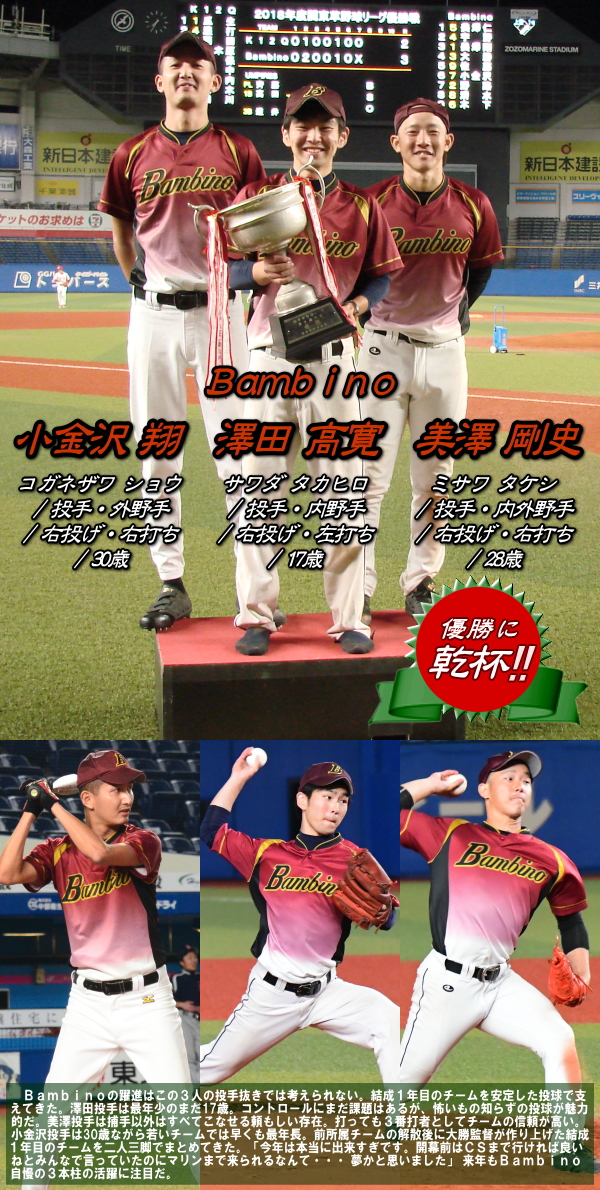 | 「こんなところまで来れるとは思ってませんでしたし、しかも勝つことができるなんて・・・ 信じられません。前進のチームから再出発したシーズンでしたが、試合を重ねる度に経験値が上がり、また、美澤兄弟や野路を中心に勝ち進む毎にチームがまとまっていきました。マリンでナイターができるなんて、人生で一度あるかないかの貴重な体験ができました」 |