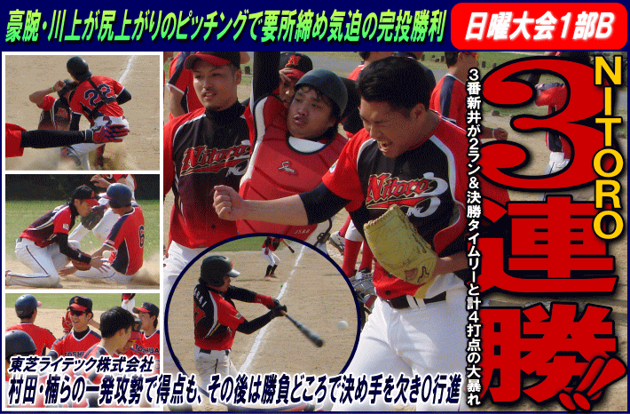 | 京浜トマホークス(川崎市) | 10 | × | 3 | 神保町プレイボーイズ(千代田区) | ||