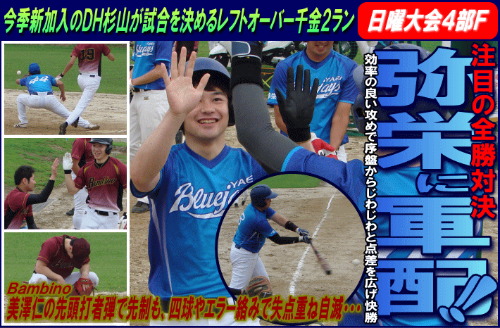 | 弥栄ブルージェイズ(相模原市) | 7 | × | 3 | Bambino(横浜市) | ||