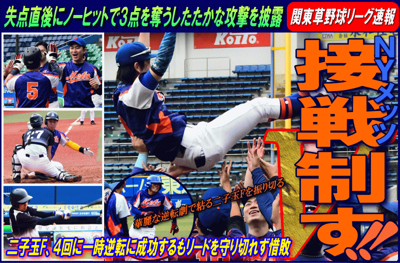 | 二子玉ファイターズは2回、先頭の西沢(裕)が2塁打で出塁し無死2塁とするも後続が倒れ、惜しい先制機を逃す。すると3回、NYメッツはヒットと四球で得たチャンスに3番尾関がタイムリーを放ち、NYメッツが先取点を奪った。点を取られた直後の4回、二子玉ファイターズはヒット3本で1死満塁のチャンスを作ると、7番田村が見事に2点タイムリーを放ちすかさず逆転に成功。だが、NYメッツはその直後に制球難に苦しむ相手投手から3連続四球で無死満塁のチャンスを作ると、その後エラーやワイルドピッチなど度重なるミスにつけこみノーヒットで3点を奪い再逆転に成功。結局、NYメッツがこのリードを守り逃げ切った。 |