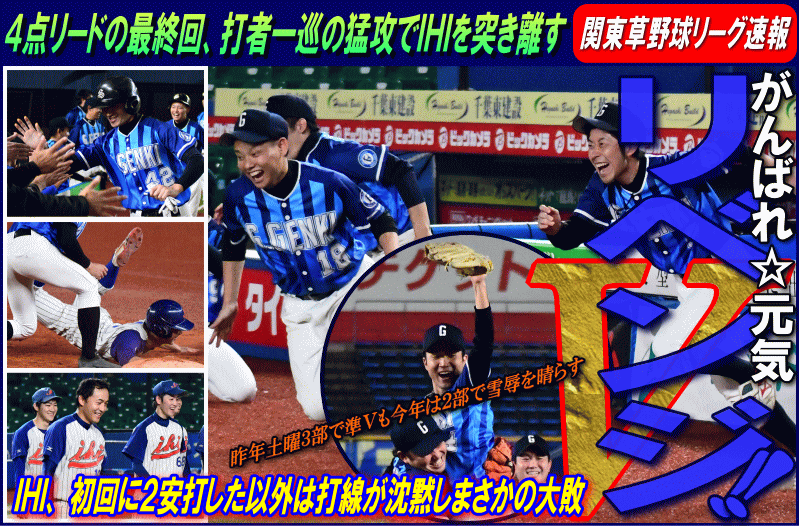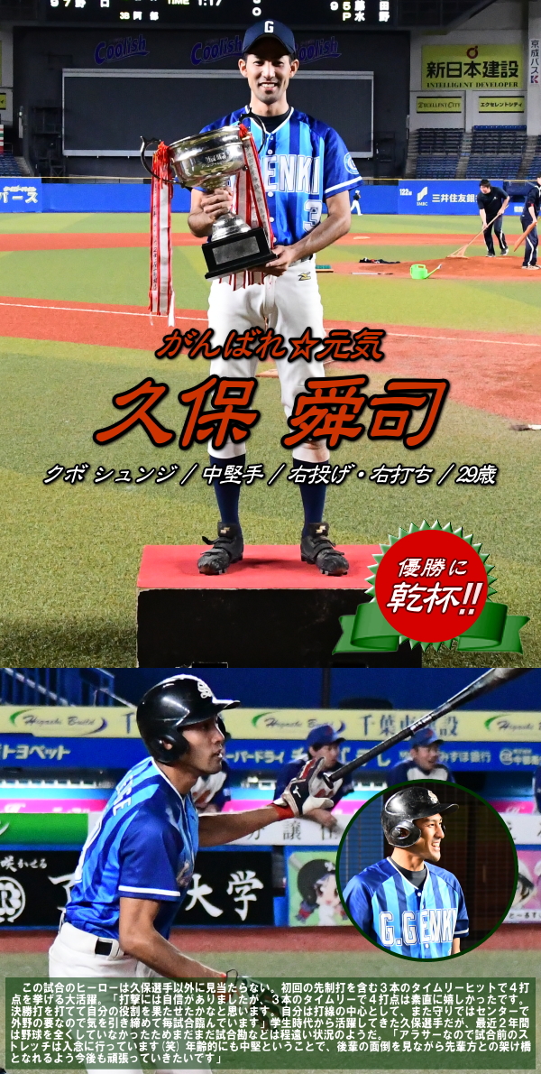 | 昨年の優勝戦で黒星を喫し涙をのんだがんばれ☆元気が、一年越しにその雪辱を晴らし、ついに夢舞台で舞った。がんばれ☆元気は初回に3番久保のタイムリーなどで幸先良く3点を先制。3回には久保にこの日2本目となるタイムリーが飛び出し、4-0とリードを広げた。6回には連続四球とヒットで無死満塁とすると、またしても久保のこの日3本目となるタイムリーや藤田の犠牲フライなどで一挙5点を奪うビッグイニングを作り一気に勝負を決めた。一方、敗れたIHIは打線が湿り初回に2安打した以外はチャンスらしいチャンスを作れずに大敗となった。 |