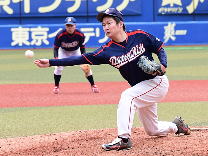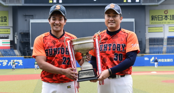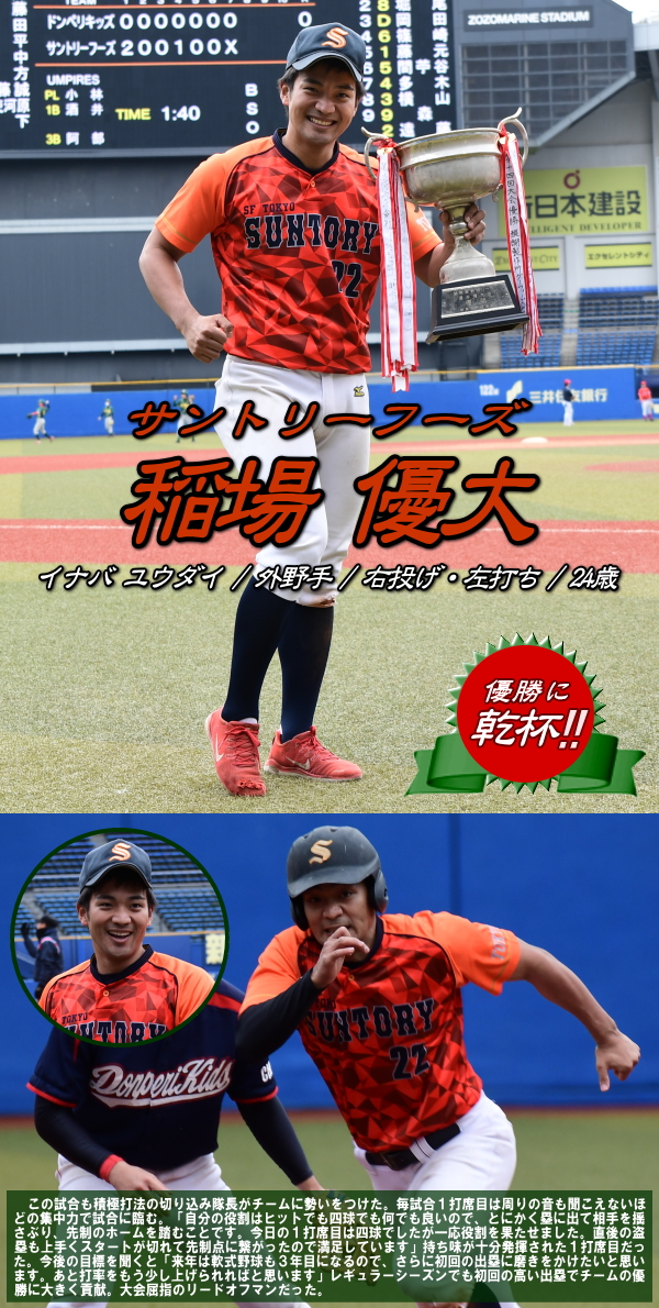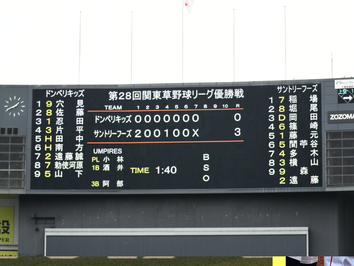 | サントリーフーズが優勝戦進出4度目にして、ついに念願だった日曜大会を制覇した。サントリーフーズは初回、今大会を沸かせている1番稲場が四球を選ぶと、俊足を生かしすかさず2盗。2番堀尾の進塁打で1死3塁とすると、ここで3番鈴木が鮮やかにライト前へタイムリーを放ち、幸先良く1点を先取する。さらに5番金子もタイムリー2ベースで続き、この回2点を先制した。サントリーフーズは4回には代打・吉武のタイムリー3ベースで貴重な追加点。投げては金子から藤元へとつなぐ投手リレーでドンペリキッズ打線を散発の3安打に封じ、見事な完封勝利。敗れたドンペリキッズは、初回の1死2塁、4回の1死3塁、7回の無死1・2塁といずれのチャンスも生かすことができず、最後までホームが遠かった。 |