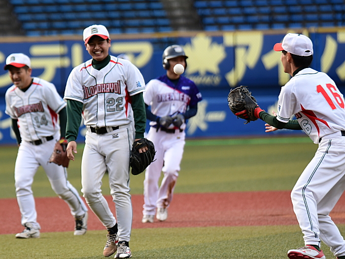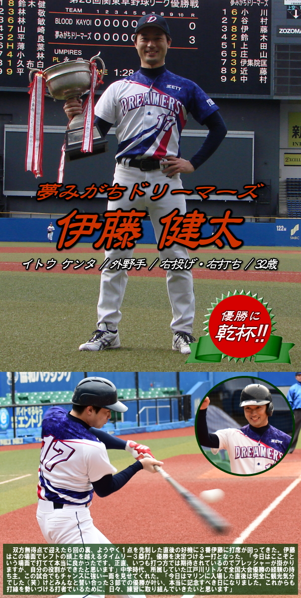KAYOIだったが、7回の攻撃はあえなく3者凡退に終わり試合終了。夢みがちドリーマーズの先発・上田が要所を締める投球で見事な完封勝利を飾った。 |
