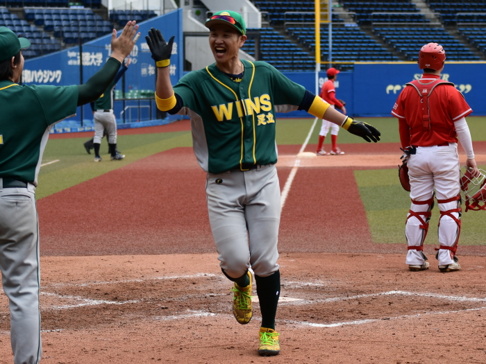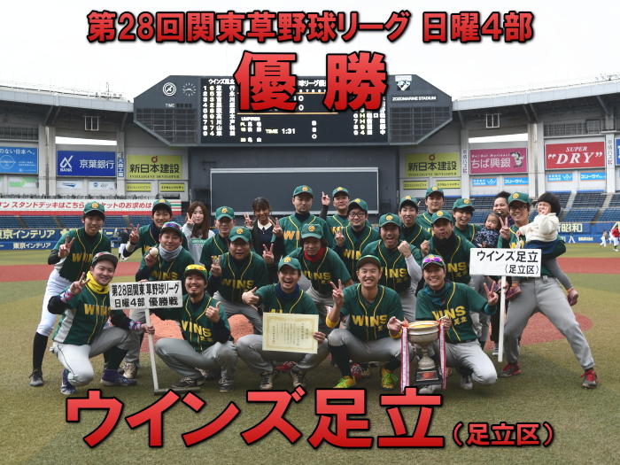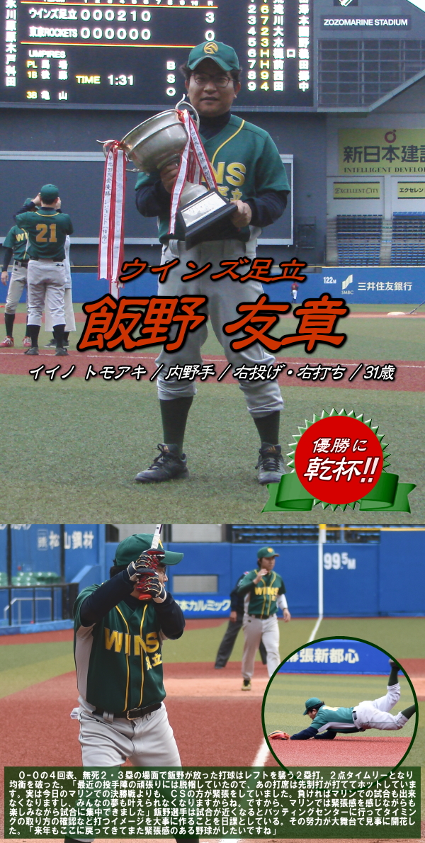 | ウインズ足立が中盤戦を制し、日曜4部優勝を決めた。試合が動いたのは4回。ウインズ足立は無死2・3塁のチャンスで、このところ打撃不振だった6番飯野がレフトにタイムリー2ベースを放ち、2点を先制する。5回には2死2・3塁の場面で、途中出場の栗原がタイムリーを放ち勝負を決めた。一方の東京ROCKETSは、初回に3番川本、4番大圖の連打で2死2・3塁のチャンスを作るも無得点。3回には1死1・3塁から、内野ゴロの間に果敢にホームを狙うも間一髪で本塁憤死。いずれも先取点のチャンスに得点が奪えず、最後まで流れに乗れなかった。 |