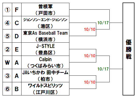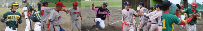 | 上段は初戦シード枠に入った曽根軍(戸田市)の戦力が充実している。レギュラーシーズンを失点9で乗り切った投手陣は完投能力のある投手が揃う。東京As Baseball Team(横浜市)はポイントゲッターの小笠原を中心に足を絡めた野球が自慢で堅守にも定評がある。ジョンソン・エンド・ジョンソン(港区)は総合力が高く、下位打線からでも得点できるのが強みだ。下段はJ-STYLE(豊島区)が中心となる。力のある直球を内外角に投げ分ける内田を中心とする投手陣に大崩れする気配がない。鈴木、佐藤、徳地のホームランバッターを中心にした打線も好調だ。J-STYLEを追うのはJAいちかわ田中チーム(柏市)だろう。『スキのない全員野球』が得意なJAいちかわ田中チームは、経験豊富な好投手を揃えて継投策で守り切る野球が秀逸だ。ワイルドカードでのクライマックス出場を決めたCalpin(つくばみらい市)は打力が自慢で打ち合いに強い。ワイルドスピリッツ(江戸川区)は粘りの野球で上位を狙う。 |