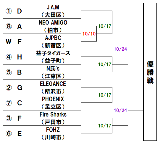 | 絶対的な優勝候補は不在だが、初戦から好カードが多い組み合わせとなった。上段では、エース黒田の投球が楽しみなHonmura Heds(川崎市)と主砲・宮口をはじめ活発な打線が売りのBraves(練馬区)との対戦は楽しみなカード。この勝者と安定感のある投球を見せる池嶋を擁する印西フェニックス(印西市)による上段ゾーンの代表争いになりそう。下段は、総合力の高いHappy Kongs(さいたま市)が中心となりそう。これを追うのは石橋・森(大)・古屋ら勝負強い打者が揃う石橋モンキーズ(台東区)と見られるが、初戦の攻守にまとまるストライクス(墨田区)戦が難関。 |