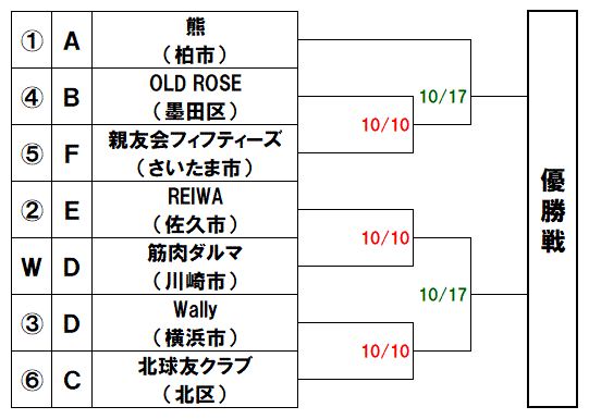 | 戦力的に突出したチームはなく、今年の初級部も混戦模様。上段は、レギュラーシーズンで勝負強い戦いを見せたOLD ROSE(墨田区)が軸になりそうだ。初戦で当たる親友会フィフティーズ(さいたま市)は好打者・中田がチームを引っ張る。熊(柏市)は安定感のある投手陣を武器に初の夢舞台を目指す。下段は、長野県・佐久市から参加のREIWA(佐久市)、投手力の良いWally(横浜市)を中心に混戦模様だ。攻撃力が自慢の筋肉ダルマ(川崎市)、ベテラン中心だが若手の新加入でチームに活気が出てきた北球友クラブ(北区)の戦いぶりも楽しみだ。 |