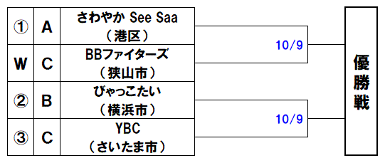 | さわやか See Saa(港区)はレギュラーシーズンを活発な打線で打ち勝ってきた強打が持ち味。対するBBファイターズ(狭山市)は、昨年上位進出を有力視されながらCSで敗れた悔しさを晴らせるか。下段のびゃっこたい(横浜市)とYBC(さいたま市)は楽しみな好カード。昨年の土曜大会の覇者・びゃっこたいはレギュラーシーズンではやや苦しんだ印象があるが、昨年のMVP・石川投手を軸に粘り強く勝ち上がってきたところはさすがだ。対するYBCは強打者・豊川、平田を中心に本塁打も多く勝負強さが光る。エース島田ら投手陣も安定しており、昨年のチャンピオン相手にどう戦うかが楽しみだ。 |