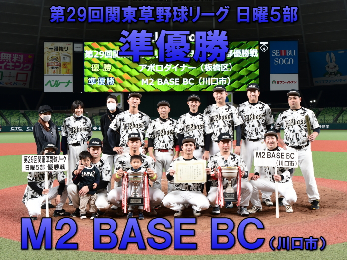 BASE BCは3回2死から得点圏にランナーを進めると、5番東の同点タイムリーで試合を振り出しに戻す。追いつかれたアポロダイナーは4回に勝ち越す。2死から、シーズン終盤戦から極度の不振が続いていた7番葛西が放った打球はセンターを襲うライナー性の当たり。これをセンターが果敢に飛び込みダイレクトキャッチを試みるもわずかに及ばず、ボールが無人の外野を転々とする間に、打った葛西が一気にホームイン。3-2と勝ち越しに成功した。粘るM2