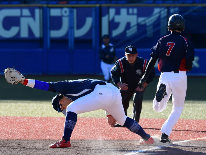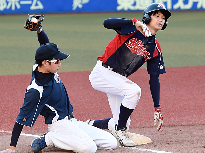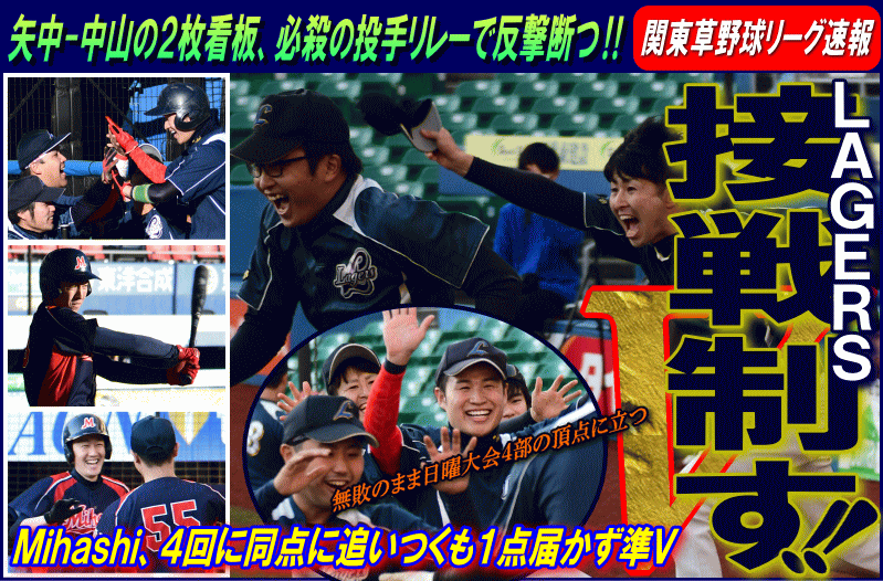 | LAGERSは初回、四球とヒットで1死1,3塁とすると4番・矢中のタイムリー2塁打で2者が帰りいきなり2点を先制する。反撃したいMihashiは4回裏、1死からヒットで走者を出すと3番・福島のタイムリー3塁打で1点を返すと、次打者の時パスボールの間に走者がかえり2−2の同点に追いつく。その後両チームとも得点が入らず試合は最終回に突入する。LAGERSは、四球とヒットで1死1,2塁のチャンスを作ると5番・柴田がライトへのタイムリー2塁打を放ち1点を勝ち越し。その後2,3塁から6番・神田のライトへの犠牲フライで1点を追加し4−2とリードを広げた。後のないMihashiはその裏猛反撃を見せる。ヒットと四球でノーアウト満塁の絶好のチャンスを作ると5番・堀のライト前ヒットで1点に詰め寄りなお無死満塁。同点、サヨナラの絶好のチャンスが続く。しかしその後まさかの3者連続三振を喫しLAGERSが最終回の大ピンチを凌ぎ4−3で逃げ切った。 |