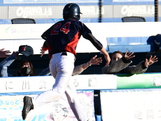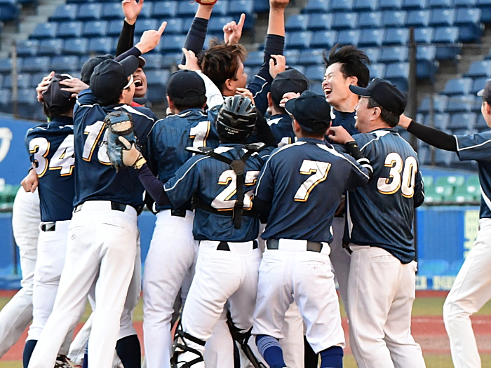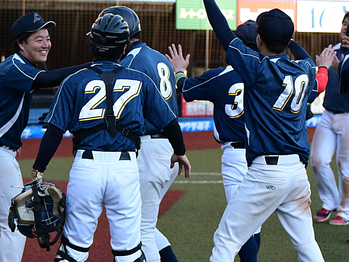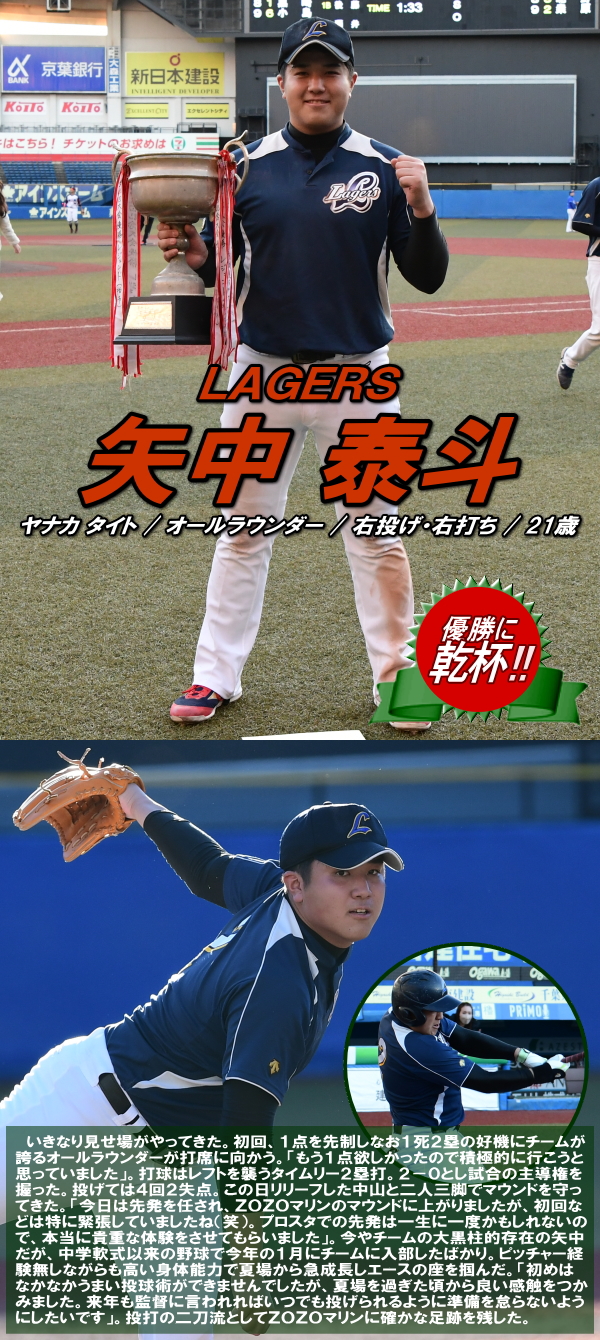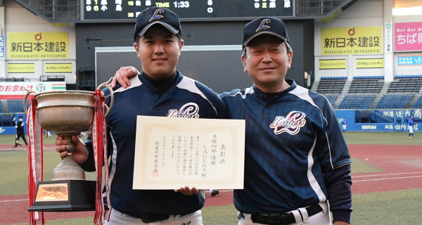 | 「しびれる試合でしたね。優勝戦にふさわしい試合内容でした。最終回は無死満塁のピンチでしたが、中山が威力のあるストレートを投げていのたで、勝つか負けるかは正直、5分5分かなと思いました。うちは決して強いチームでは無いですが、今年は間草さんに力を入れて結果が出せたので、本当に良い一年になりました。ここまで来ることができたのは先発をした矢中が投手経験は無いながらも、夏場から急成長してくれて、投手に軸ができたことです。今後の目標としては相手のレベルは上がるとは思いますが、うちも成長を止めないで、上のレベルで野球がしたいですね」 |