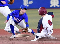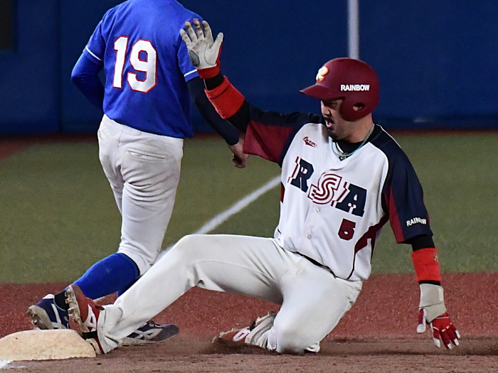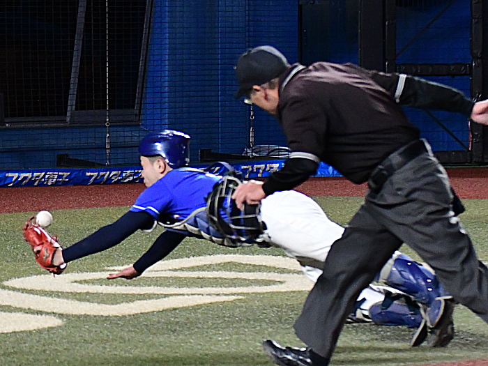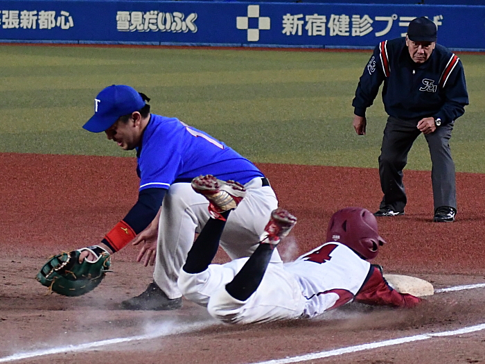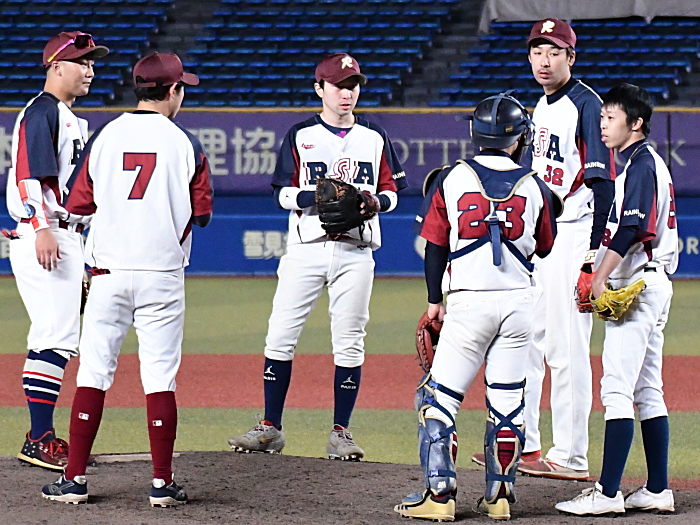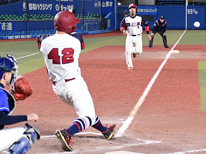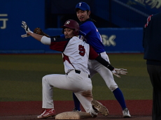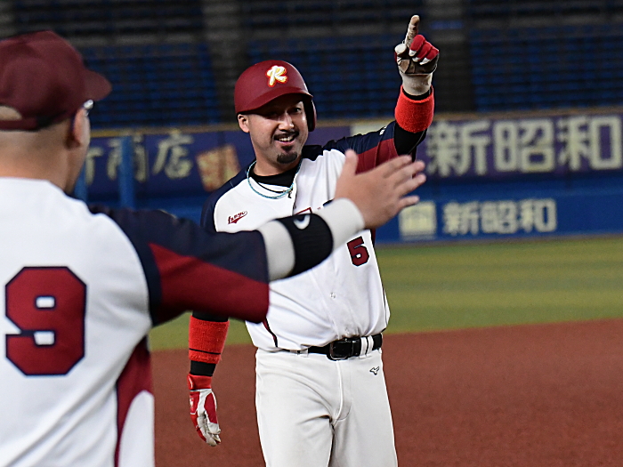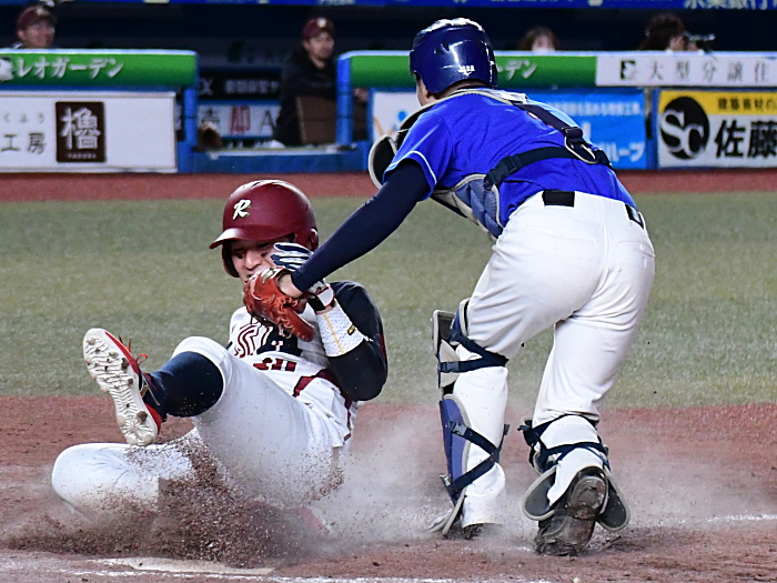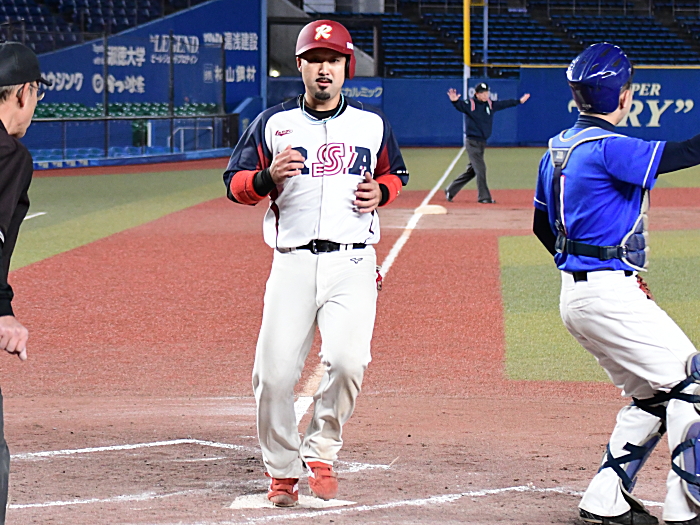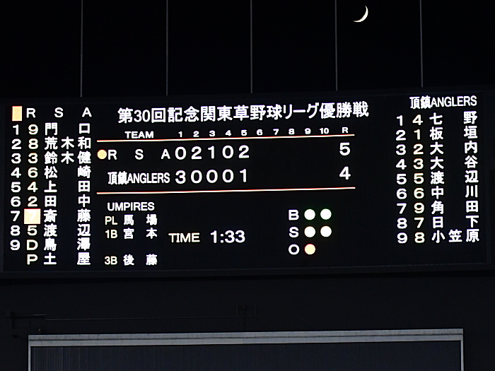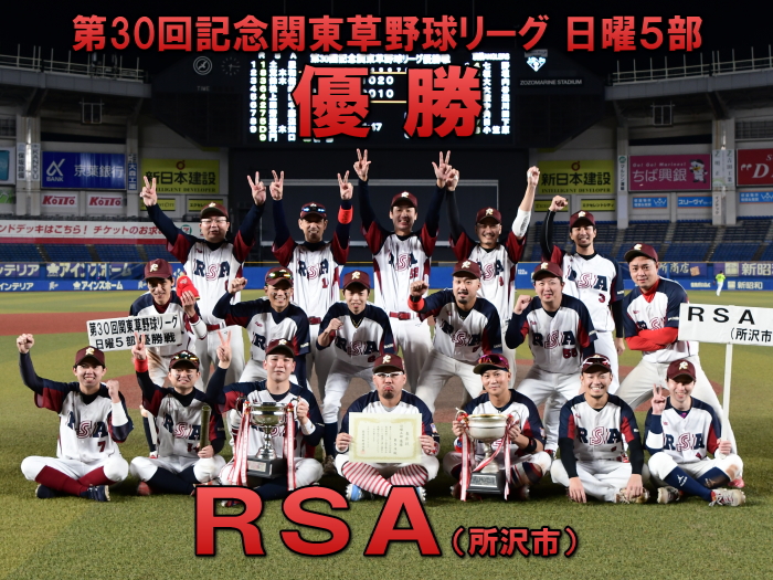 | 頂鎮アングラーズは1回裏、無死1,2塁から3番・大内のライトへのタイムリー3塁打でまず2点、その後相手エラーで1点を加えいきなり3点を先制する。追うRSAは2回表、1死2塁のチャンスを作ると、7番・石原のレフト前タイムリーヒットでまず1点を返す。さらに2死2塁から相手エラーで1点を加え2−3と1点差に詰め寄る。さらにRSAは3回にも相手エラーの間に1点を奪い3−3の同点に追いつく。RSAは5回表にも1死から1番・平野の左中間への3塁打、2番・荒木(知)も逆転打となるタイムリー3塁打で続き、ついに4−3と試合をリードする。さらに2死後相手エラーでもう1点を追加し5−3と2点差とする。追いつきたい頂鎮アングラーズはその裏、四死球で満塁とすると内野ゴロの間に1点を返し5−4と1点差まで迫る。しかし反撃もここまで。RSAが1点差を守り日曜5部の頂点に立った。 |