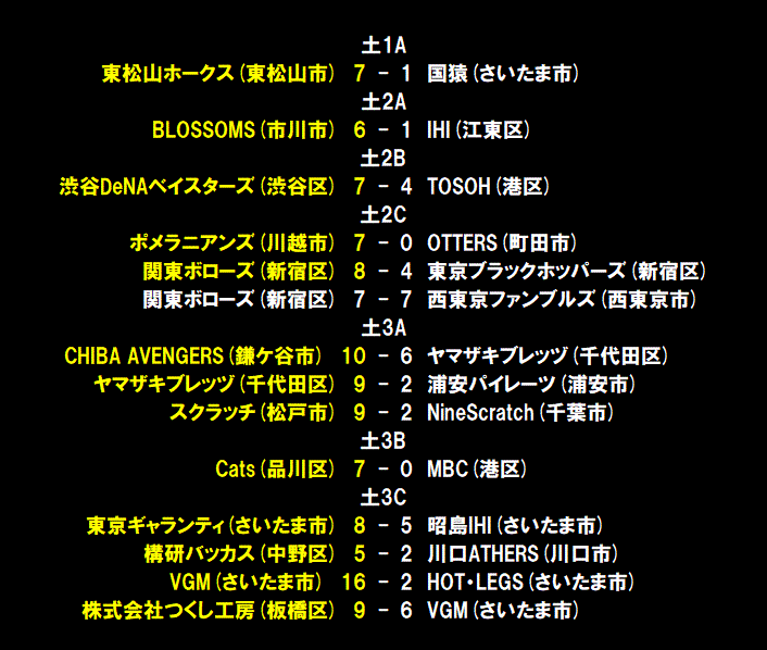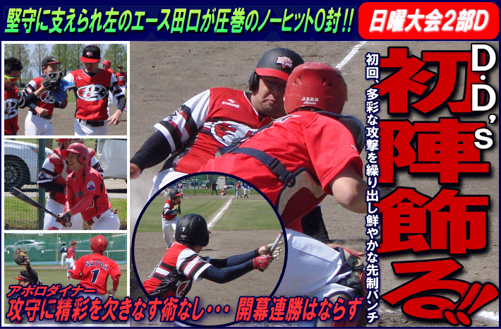 | 今シーズンから初参戦のD.D'sが理想的な試合運びで投打に快勝、初陣を飾った。D.D'sは初回、2番・井上の3塁打で1死3塁のチャンスを作ると、続く3番・柏倉が放った痛烈なライナーがショートのグラブをはじくタイムリーとなり、瞬く間に1点を先制。さらにその後、エンドランとホームスチールで2点を加え、幸先良く3点を奪った。勢いづいたD.D'sは4回にもタイムリーとホームスチールで2得点。6回にもタイムリーで1点を追加し勝負を決めた。一方のアポロダイナーは、D.D'sの好左腕・田口投手の前に打線が大沈黙。出した走者は死球の走者1人のみと完璧に封じられ、なす術がなかった。 |