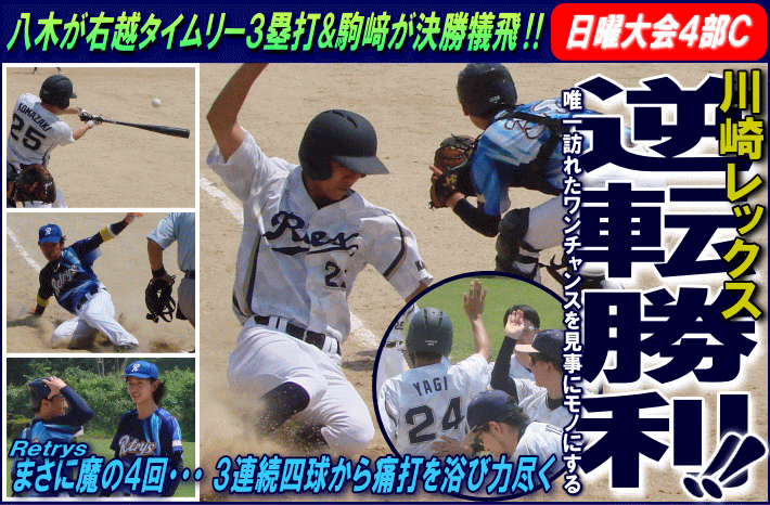 | 先手を取ったのはRetrys。Retrysは初回、瀬川の2塁打とバッテリーエラーで2死ながら3塁のチャンスに4番・斉藤がセンター前に弾き返し早くも1点を先制する。追う川崎レックスの反撃は4回。Retrysのエース柴田の前に3回までパーフェクトに封じられていたが、この回先頭の佐藤が四球を選びこの試合初めての出塁を果たすとその後さらに連続四球で無死満塁のビッグチャンスをつかむ。ここで次打者のショートゴロの間に1点を返しまず同点とすると、続く3番・八木がライトオーバーのタイムリー3ベースを放ち勝ち越し。さらに続く4番・駒﨑がレフトへ犠牲フライを放ち、結局この回4点を挙げ川崎レックスが一気に試合をひっくり返した。一方のRetrysもその裏連続ヒットからチャンスメイクすると、相手エラーと内野ゴロの間に2点を返し1点差に詰め寄る。しかし反撃もここまで。ワンチャンスを生かした川崎レックスの勝利となった。 |