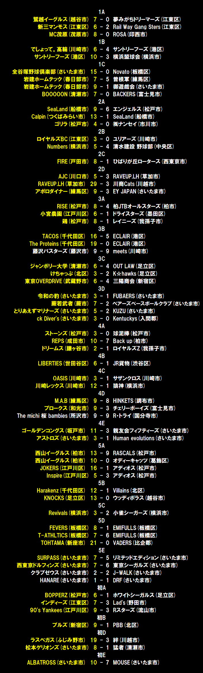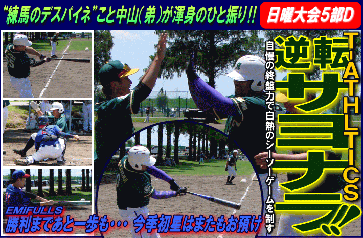 | EMIFULLSは初回、連続四死球で1死1・2塁のチャンスに4番・鈴木が3塁線を鋭くやぶるホームランを放ちいきなり3点を先制。T-ATHLTICSもその裏、ヒットと四球、盗塁で無死2・3塁から内野ゴロの間にまず1点。さらに4番・大島がレフトオーバーの2ランを放ちすぐさま同点とする。T-ATHLTICSは3回には再び大島のタイムリーと相手エラーで2点を挙げ勝ち越し。しかしEMIFULLSも直後の4回にヒット2本と四球で2死ながら満塁とすると押し出し四球と相手エラーで試合を振り出しに戻した。同点のまま迎えた5回、EMIFULLSはヒットと四死球で2死満塁から押し出し四球でついに勝ち越しに成功。あとがなくなったT-ATHLTICSはその裏、この日当たっている先頭の4番・大島が2塁打で出塁すると続く5番・住吉がレフト線へタイムリー2ベースを放ち瞬く間に同点に。その後進塁打を挟み1死3塁とすると、ここで打席には練馬のデスパイネこと6番・中山(弟)。カウント2-2からのインコースのボールを豪快に振り抜くと、打球はセンターオーバーのサヨナラタイムリーとなり、T-ATHLTICSが土壇場で安打を重ね競り勝った。 |