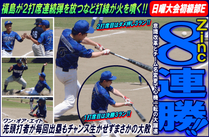 | Zincは初回、木津のタイムリーと福島のレフトオーバーの3ランでいきなり4点を先制。さらにZincは続く2回にも、先ほどホームランの福島が2打席連発となる3ラン、さらに木暮、伊藤らにもタイムリーが飛び出し、結局この回8点を奪い一気に試合を決めた。Zincはその後も4回に高野のタイムリーなどで4点、5回には新井の本塁打で2点を追加し、終わってみれば先発全員出塁の猛攻で大量18得点を挙げ、大会規定により5回コールド勝ちとなった。一方のワン・オア・エイトは毎回先頭打者を出塁させるもチャンスを生かせず4回まで無得点。最終回にリードオフマン唐木の2塁打から作ったチャンスに押し出し死球で2点を奪うが反撃もここまで。Zincが強打で打ち勝った。 |