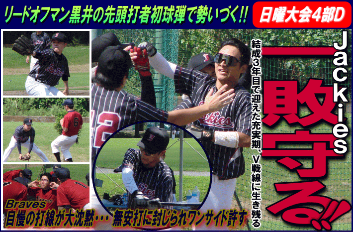 | アメリカ生まれの投打のヒーローの活躍でJackiesが完勝した。Jackiesは初回、先頭の黒井がその初球をいきなり振り抜くと、これが右中間を破るホームランとなり、鮮やかな先頭打者初球弾で1点を先制する。これで勢いに乗ったJackiesは3回には5番・須合のレフトオーバーの2ランなどで一挙4点を追加。さらに5回にも先制弾の黒井のヒットを起点に2点を奪い、7-0とリードを広げた。投げてはエース山本がBraves打線を無安打に封じる堂々のピッチングを披露。投打がかみ合ったJackiesが5回コールド勝ちで1敗を守った。敗れたBravesは自慢の強力打線が沈黙。攻守に精彩を欠き完敗を喫した。 |