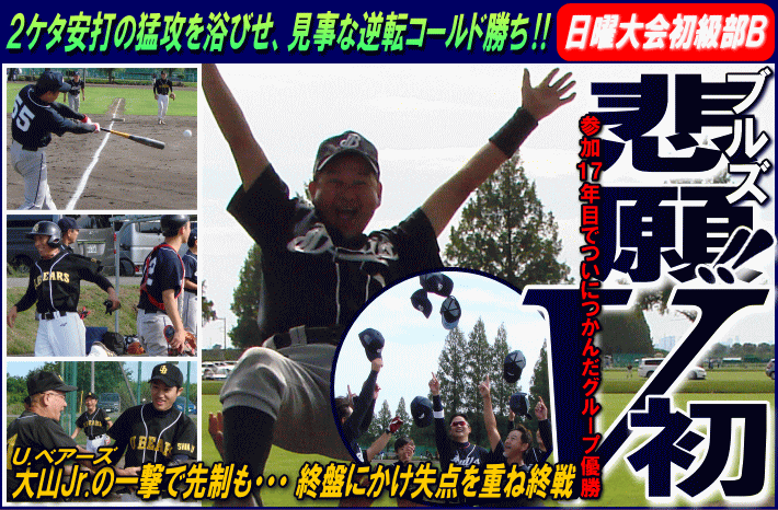 | 両軍ともに参加17年目というベテランチーム同士の顔合わせとなったこの試合。先制したのはU.ベアーズだった。U.ベアーズは3回、この回先頭の2番・鈴木が四球で出塁すると、続く3番・大山Jr.がレフトへ3塁打を放ち先取点。さらに送球ミスの間に打った大山Jr.も生還し、この回2点を先制した。後手に回ったブルズの反撃は4回。1番・安達のチーム初ヒットを起点にチャンスを作ると、3番・城田のタイムリー3ベースでまず同点。さらに4番・時本もタイムリーで続き、鮮やかな集中打で一気に逆転に成功した。5回にも追加点を挙げ流れをつかんだブルズは6回に更なる猛攻を見せる。城田・時本・福田・山口の4連打などで4点を奪いリードを広げると、最後は日達(哲)がコールドを決めるタイムリーを放ちゲームセット。ブルズが見事な逆転劇で勝利し、長年の悲願だったグループ初優勝を飾った。敗れたU.ベアーズは再三の得点圏であと1本が出ず、追加点が遠かった。 |