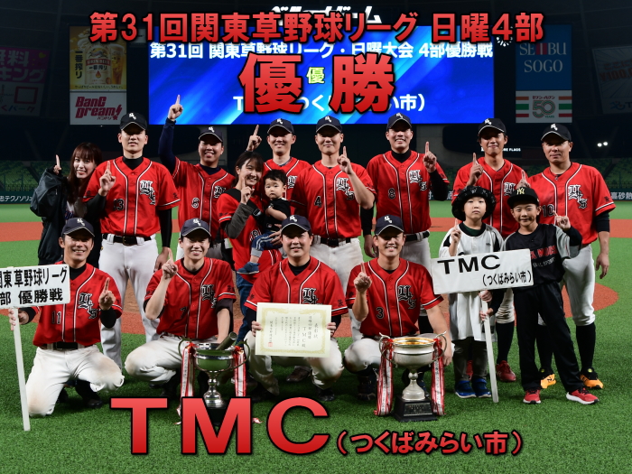 | TMCは1回裏、1死1塁から3番・仮屋の右中間へのタイムリースリーベースと4番・水越の内野ゴロの間に2点を先制する。追いつきたい川崎レックスは4回表、2死3塁の好機に主砲・梅澤がセンター前タイムリーヒットを放ち1点を返す。追い上げられたTMCはその裏、ヒットと死球で1死1,2塁のチャンスを作ると、その後併殺崩れの間に2塁ランナーが生還して貴重な3点目を奪う。その後両チームともにチャンスを作るも、TMC古谷、川崎レックス駒崎の両先発投手が得点を許さずそのまま試合終了。TMCが3−1で川崎レックスを下し日曜4部の頂点に輝いた。 |