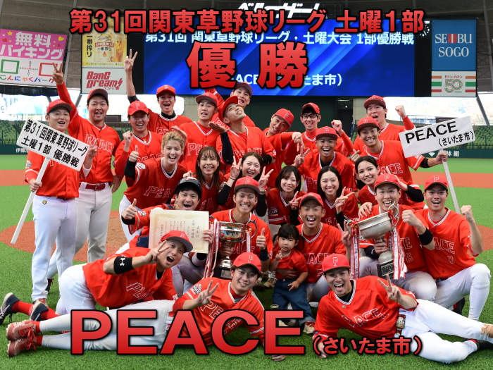 | PEACEは初回1番・小平が四球で出塁。次打者の内野ゴロで2塁に進むと3番・渡部がレフトオーバーのタイムリー2塁打を放ち1点を先制。 一方のBBファイターズは2回と4回にチャンスを作るもあと1本が出ず無得点が続く。追加点が欲しいPEACEは5回、6番・平田のスリーベースでチャンスを作ると、7番・岡本がきっちりとセンターへ弾き返すタイムリーヒットでまず1点。さらに8番・佐藤もヒットで続き1,3塁とすると9番・相川の犠牲フライの間に1点追加。3−0とさらにリードを広げた。逆転したいBBファイターズは最終回、1死から5番・荒木、7番・高橋らのヒットで2死1、2塁のチャンスを作るも、後一本が出ず完封負け。勝ったPEACEは昨年の雪辱を晴らし、初の関東草野球リーグ・土曜大会の王者に輝いた。 |