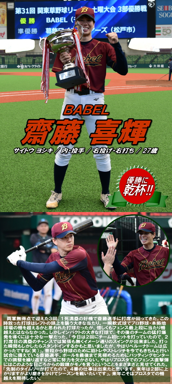 | BABELは2回、1死から2つの四球と内野安打で満塁とすると、ここで主砲・齋藤が走者一掃となるレフトフェンス直撃のタイムリー3ベースを放ち3点を先制。さらにその後も次々にタイムリーヒットが飛び出し結局この回一挙に7点を奪う。追う葛飾ワイルドベアーズはその裏、1死から四球とエラーで1・2塁とすると、1番・大塚がチーム初となるヒットがタイムリーとなり1点を返す。しかし追加点が欲しいBABELは5回、内野安打とエラーで1死1,2塁とすると,1番・川村がセンターオーバーとなるタイムリー2塁打を放ちまず2点。さらにその後も4番・小林、5番・森下らのダメ押しとなるタイムリーヒット等でさらにリードを広げ、この回計5点を奪い12−1とし勝負を決めた。 |