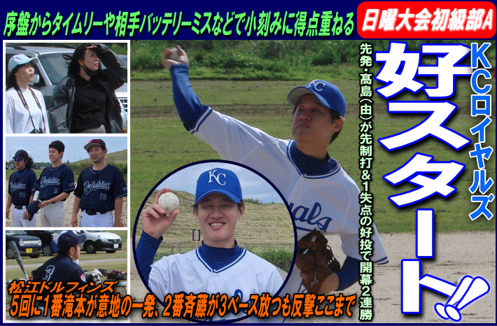 | KCロイヤルズは初回に先頭打者・鈴木のヒットと四球で1死1、2塁とすると、4番髙島(由)が先制タイムリーを放つ。先制を許した松江ドルフィンズだが1回は3者連続三振に終わる。2回のKCロイヤルズは2死から3連続四球を選ぶと、パスボールとデットボールで2点を追加する。3回にも相手バッテリーのミスで1点を奪う。なんとか追いつきたい松江ドルフィンズは5回にこの回先頭の1番滝本の本塁打で1点を返す。続く2番斉藤が3ベースで続き、無死3塁とするも後続が経たれチャンスを潰す。最終6回も3者凡退に打ち取られ、KCロイヤルズが逃げ切り、開幕から2連勝を決めた。 |
