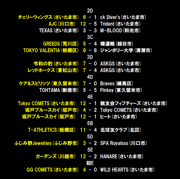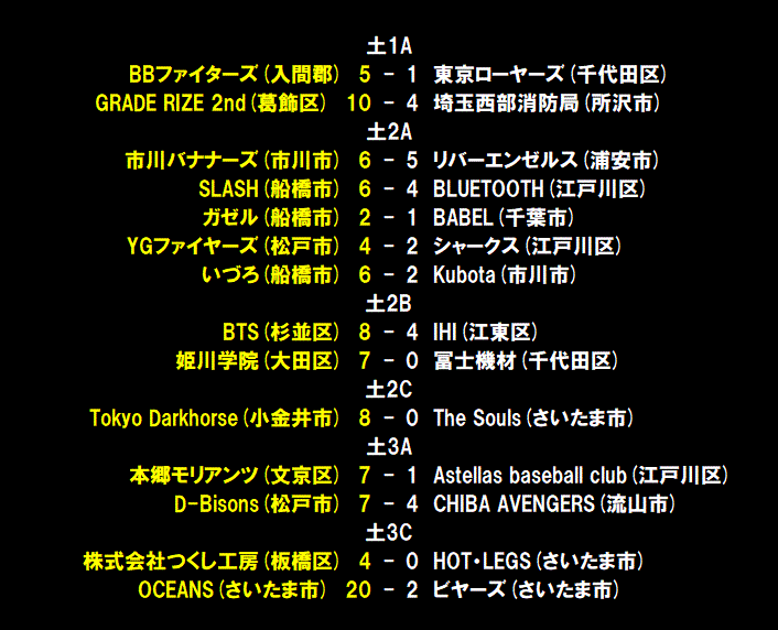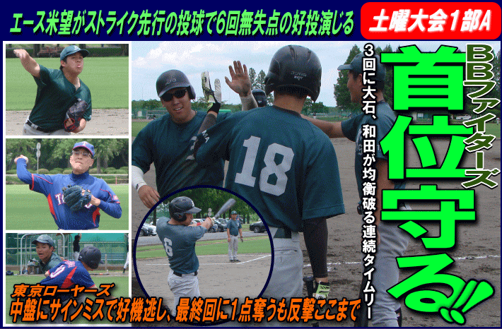 | BBファイターズは3回に1番大石のタイムリーで先制すると、続く2番和田がセンターオーバー打を放ち、2点を先制。一方の東京ローヤーズは4回1死から4番柘植がヒットで出塁も5番松岡の打球がサードライナーで1塁走者の柘植が戻れずにダブルプレーに終わる。5回には1死1、3塁のチャンスを作るも、サインミスから3塁走者が挟まれタッチアウトで無得点。一方のBBファイターズは6回にもタイムリーなどで3点を追加して5-0とリードを広げる。後の無い東京ローヤーズは最終回に1点を奪うも反撃はここまで。勝ったBBファイターズは6勝1分けで首位をキープした。 |