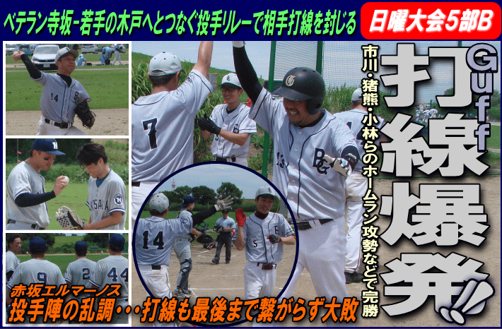 | Guffは初回に市川の先頭打者アーチで先制すると、その後も7番猪熊が2死満塁のチャンスで2点タイムリーを放ち3点を先制する。2回には相手投手の乱調から4つの押し出しで4点を奪うと、なおも満塁の好機で7番猪熊が6打点目となる満塁弾を放ち、一挙8点を奪う猛攻でさらにリードを広げる。一方の赤坂エルマーノスは3回に1番今宿のヒットなどで2死1、3塁も後続が倒れ無得点。Guffは3回にはこの日チーム3本目となる小林の本塁打でダメ押し。コールド勝ちを決めた。負けた赤坂エルマーノスは最後まで打線がつながらず、今季5敗目を喫した。 |