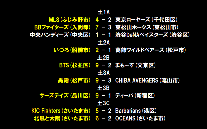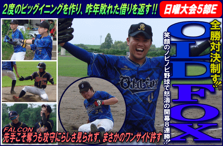 | 注目の全勝対決はOLD FOXが完勝し、昨年敗れた雪辱を果たすとともに開幕からの連勝を8に伸した。試合は初回から動く。FALCONは連打と盗塁で無死2・3塁のチャンスを作ると、4番・荒川の犠牲フライで1点を先制する。ピンチを最少失点で切り抜けたOLD