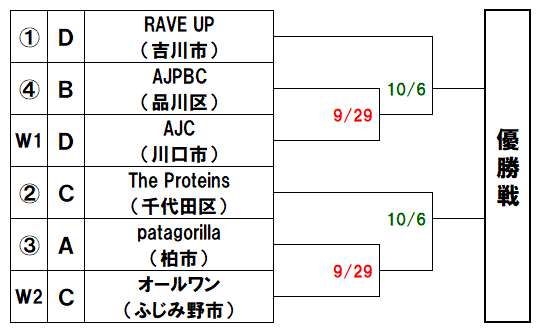 | 下段のThe Proteins(千代田区)は昨年もプロスタを経験。強力打線は健在で、レギュラーシーズン最終戦でも4点ビハインドの最終回に一挙5点を奪い劇的な逆転サヨナラを果たすなど今年も終盤に粘り強さを見せる。初出場でCS進出を果たしたpatagorilla(柏市)は好左腕・池田の投球に注目。対するオールワン(ふじみ野市)は草野球経験豊富な選手が多く、この試合でも変化球を上手く見極めて好投手の池田を早い回で攻略したい。上段の初戦AJPBC(品川区)とAJC(川口市)の一戦は見応えがありそうだ。ともに高い守備力を誇りどちらがロースコアの展開で勝機を見いだせるか。この勝者を迎え撃つRAVE UP(吉川市)の鎌田はホームランも打てるスピードスターだ。 |