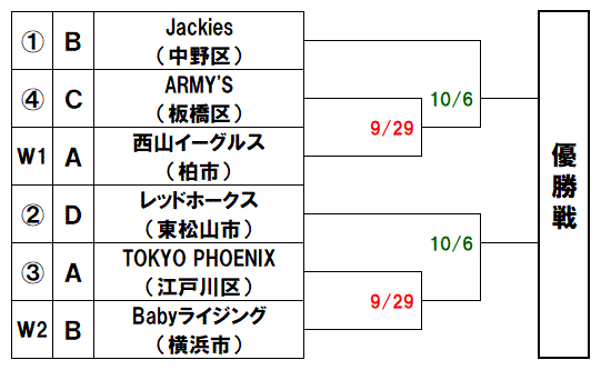 | 全体3位通過ながらTOKYO PHOENIX(江戸川区)の総合力が高く、一歩リードしている印象だ。2枚看板の江川・渡邉は制球力が高く、安定感がある。打線もリードオフマンの古矢が高い出塁率を誇り3番・佐藤を中心とした勝負強いクリーンアップで返すのが必勝パターン。初戦で対するBabyライジング(横浜市)はレギュラーシーズンでやや失点が多かった投手陣がうまくかわし、競り合いに持ち込みたい。この勝者を迎え撃つレッドホークス(東松山市)はレギュラーシーズンを無敗で通過するなど総合力が高い。上段の初戦、ARMY’S(板橋区)と昨年プロスタを経験した西山イーグルス(柏市)の顔合わせは注目だ。ARMY’Sはレギュラーシーズンを出場チーム中2位の失点14で通過。投手陣の安定感は抜群だ。西山イーグルスは強打を誇る。1番・馬込は打率5割を誇りその出塁が鍵を握る。昨年課題であった投手力も今年は新戦力のエース・和田がレギュラーシーズンで大車輪の活躍を見せており期待できそうだ。この勝者が優勝戦をかけて争うJackies(中野区)は三木、須合ら勝負強い打者が多く打線に切れ目がない。 |