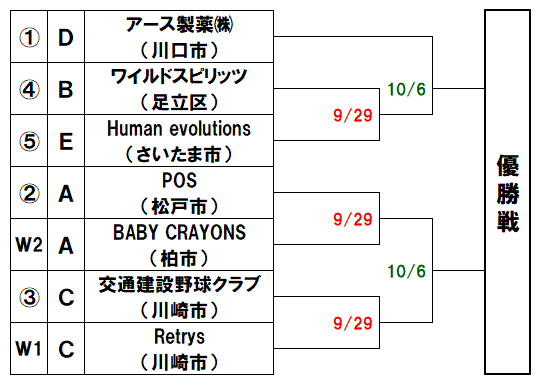 | レギュラーシーズンを1位で通過したアース製薬(川口市)を崩すのは簡単ではない。安定感のあるエース・菅澤に4部大会屈指の強力打線を擁し優勝候補の筆頭だ。2位通過のPOS(松戸市)は若林、石塚の1・2番コンビの出塁が優勝戦進出のカギを握る。そのPOSと初戦で対戦するのは同グループのBABY CRAYONS(柏市)。レギュラーシーズンでは対戦が無かっただけに真のグループ優勝も掛かる一戦だ。上段のHuman evolutions(さいたま市)は投打に躍動するエース・松本の活躍に期待。対するワイルドスピリッツ(足立区)はリーグの初戦こそ黒星を喫したが、その後9連勝でCSの切符を掴んだ勢いは驚異的。下段の1回戦、全員野球が信条の交通建設野球クラブ(川崎市)と名将・羽田野監督率いるRetrys(川崎市)の一戦はレギュラーシーズンでは5-5の引き分け。CSで雌雄を決し弾みをつけたい。 |