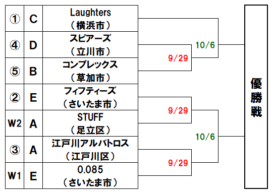 | 今年も戦力的に突出したチームはなく、例年同様歴史のあるチームが多く勝ち残るなど混戦模様。上段のコンプレックス(草加市)は平均年齢50歳中盤の大ベテランチーム。川端兄弟が投打の軸となってチームを引っ張っている。初戦で当たる粘りのあるスピアーズ(立川市)戦を勢いの出る形で勝ち上がれば1位通過で投打にまとまるLaughters(横浜市)とも好勝負が出来るはずだ。下段はワイルドカードで出場ながら投球に安定感のある斎藤を擁するSTUFF(足立区)に注目。チャンスに強い熊井の前に走者を出し斎藤をいかに援護できるかが鍵。STUFFと初戦で当たるのは大会参加20年目の伝統チーム・フィフティーズ(さいたま市)。勝負強い守屋を中心とした打線が投手陣を援護出来ればCSでも活躍が期待できそうだ。江戸川アルバトロス(江戸川区)と0.085(さいたま市)の対戦は横山、清宮の両エースの投げ合いが予想される。 |