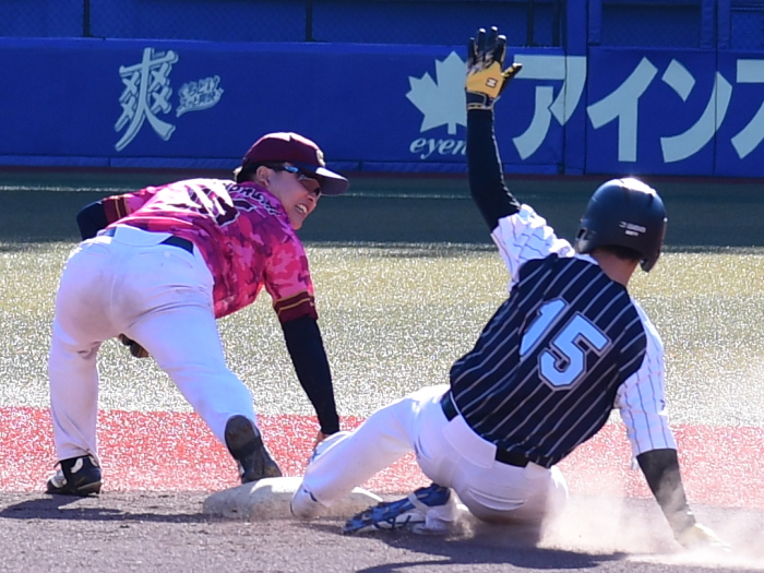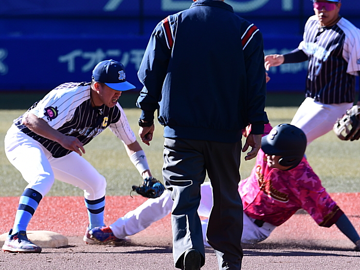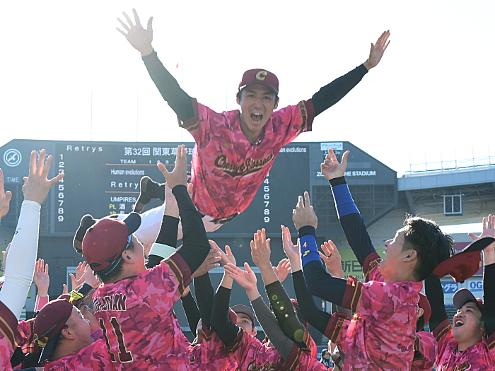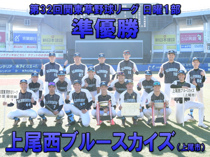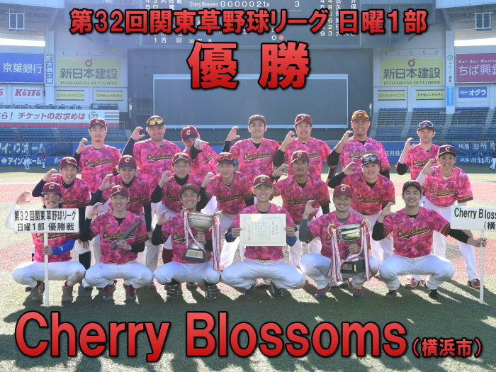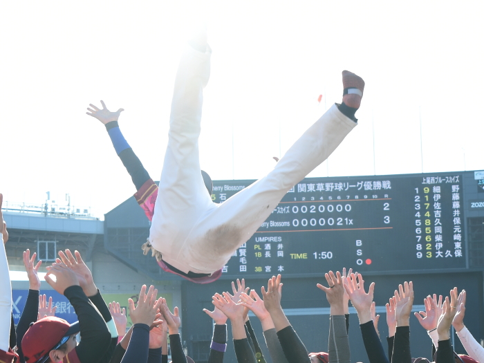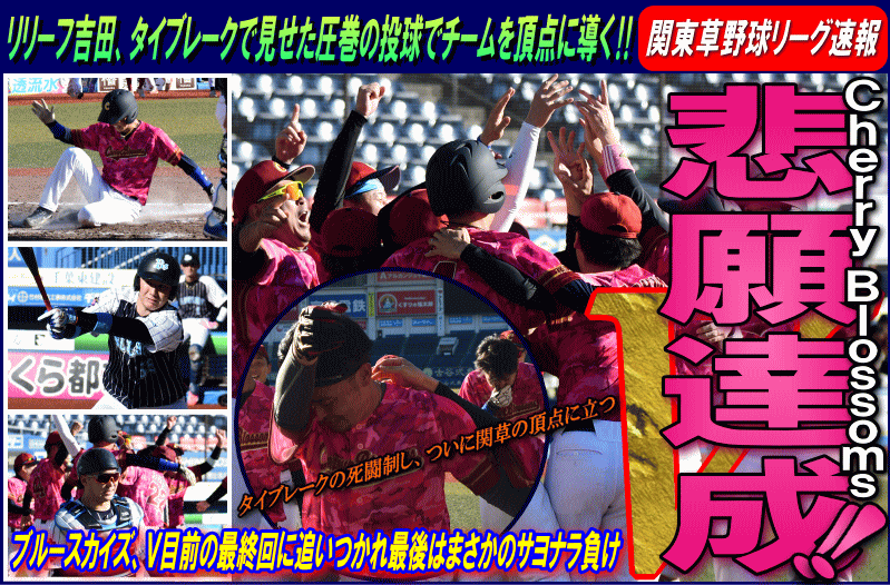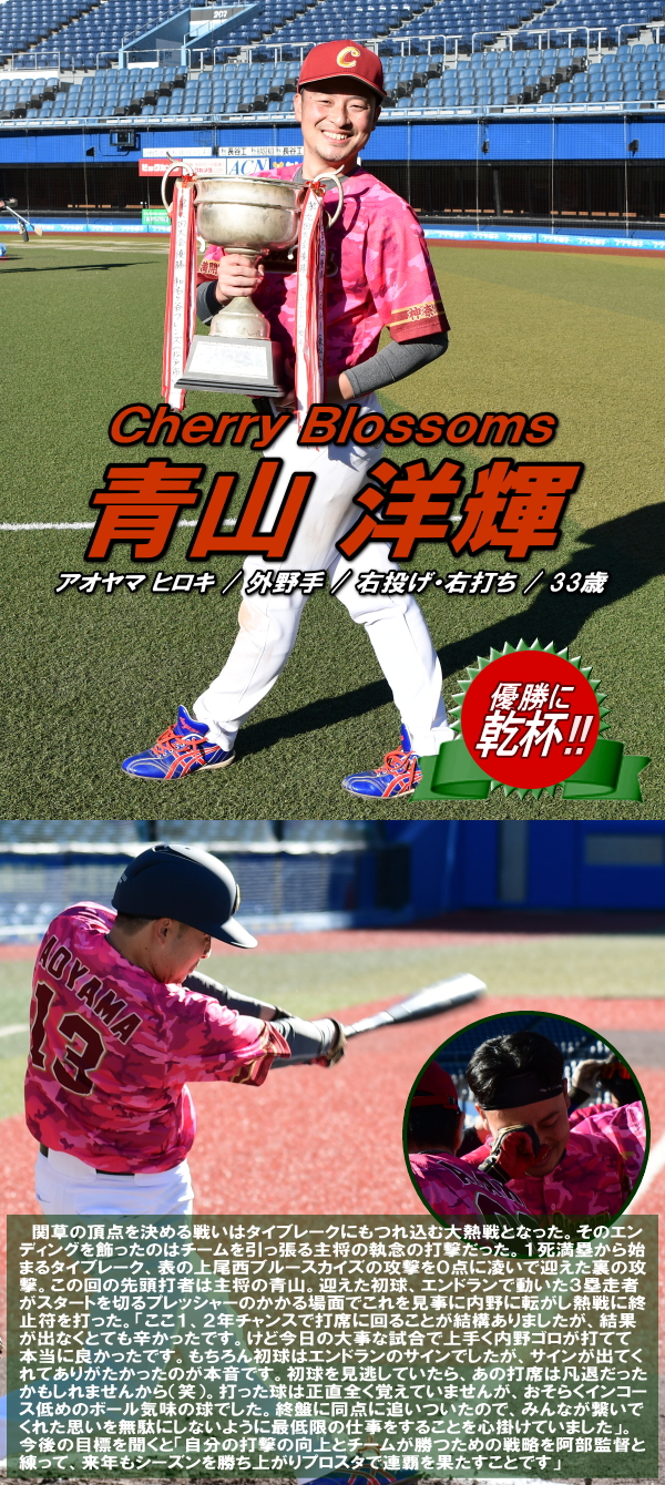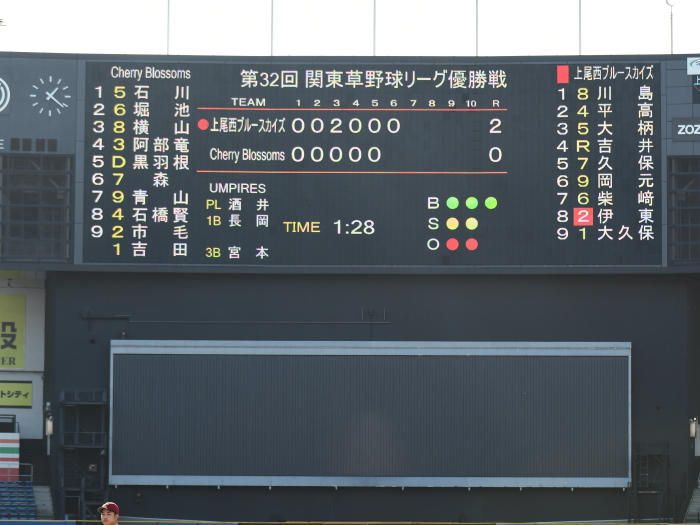 今年度の関草のトップを決める注目の一戦。最初に試合が動いたのは3回表の上尾西ブルースカイズの攻撃。エラーと四死球で2死満塁とすると、ここで迎えた主砲・森が追い込まれながらもレフト前にタイムリーヒットを放ち幸先よく2点を先制する。上尾西ブルースカイズはその後追加点がなかなか奪えず試合の流れは徐々にCherry Blossomsに傾く。追いつきたいCherry Blossomsはようやく6回に反撃のチャンスが訪れる。この回先頭の1番石川が2塁打で出塁。さらに堀池、阿部(竜)が四球を選び1死満塁とし一打同点のチャンスを作る。ここで代打・瀧が放った打球はショートゴロ。併殺かと思われたが併殺崩れと送球ミスの間に2者がホームイン。2−2とし土壇場で同点に追いつく。その後、緊迫した頂上決戦は7回から1死満塁・継続打順からスタートするタイブレークに突入。先攻の上尾西ブルースカイズは4回から好リリーフのCherry Blossoms吉田の気迫の投球の前に連続三振を喫し、手痛い無得点に終わる。一方のCherry Blossomsはその裏、この回先頭の7番青山の打席で初球からエンドランを敢行。青山は見事にバットに当て内野に転がしこの間に3塁走者が生還。劇的なサヨナラ勝ちでCherry Blossomsはリーグ参戦6年目でついに関東草野球リーグの頂点に立った。