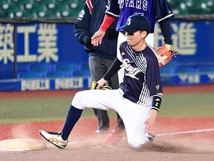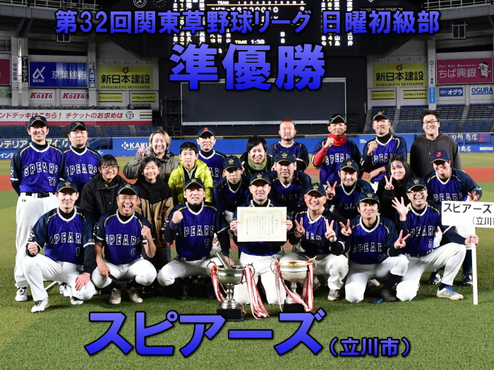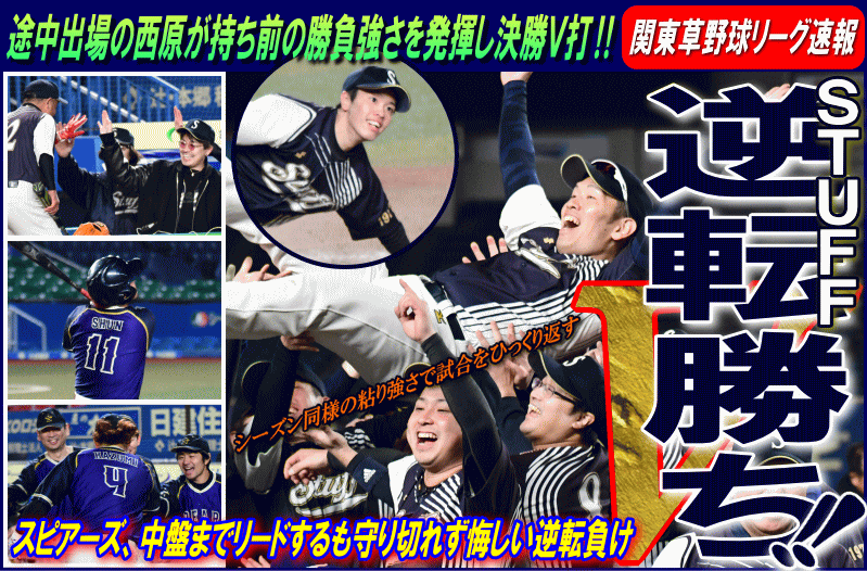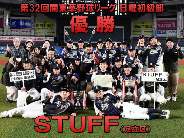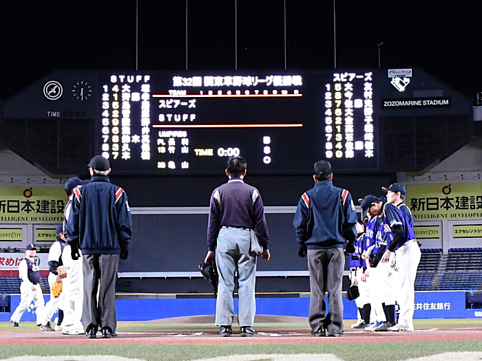 | スピアーズは初回、大友、今村の1、2番コンビの連続ヒットと盗塁で1死2、3塁のチャンスを作ると4番大野の打席で相手バッテリーのワイルドピッチの間に1点を先制。スピアーズはさらにこの回、内野ゴロの間にもう1点を加え2−0と幸先よく2点を先取する。一方のSTUFFは初回に2番斉藤(孝)がセンター前ヒット、4番菅原が四球を選び2死ながら1、2塁とするが後続が倒れ無得点に終わる。追加点を奪いたいスピアーズは2回、6番高橋がエラーで出塁、続く7番石崎のレフト前ヒットで無死1、2塁のチャンスを作るも、その後3者連続三振に打ち取られこれまたチャンスを逃す。2点を追うSTUFFの反撃は5回。1番小久保(明)のヒットなどで1死満塁のチャンスを作ると、代打に入った栗原(健)監督がサードライン際に2点タイムリーヒットを放ち2−2の同点に追いつく。しかし追いつかれたスピアーズは直後の6回にすぐさま突き放す。先頭の4番大野が四球、5番金子の打った打球はセンター前に落ちるポテンヒットで1塁ランナーの大野が果敢な走塁で3塁を狙うと、相手の悪送球を誘いこの間に一気にホームインして3−2と勝ち越しに成功する。しかし同点に追いつきたいSTUFFは直後の6回にまたまた反撃を見せる。2死から2番福田が死球で出塁。続く途中出場の3番西原の放った打球はセンターを襲う痛烈なライナー。この打球がセンターの前で大きくバウンドし打球が外野深くに転々と転がる間に1塁走者に続き打った西原も俊足を生かして一気にホームインし4−3と逆転に成功する。結局このリードを守り切ったSTUFFが結成47年目にして嬉しい初のタイトルを手に入れた。 |