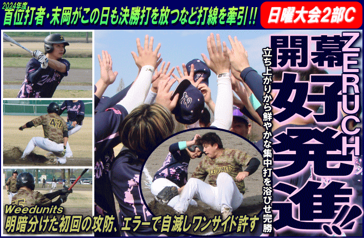 | Weedunitsは初回、2番・佐藤がヒットで出塁するとすかさず2盗を決め1死2塁のチャンスをつかむが後続が倒れ無得点。一方のZERUCHはその裏、連続ヒットで無死1・2塁の好機に3番・末岡がライトオーバーの2塁打を放ち、鮮やかな3連打でまず1点を先取。さらに相手ミスなどで得点を加え、結局この回5安打を集中させ一挙4点を先制した。勢いづいたZERUCHはその後も相手エラーを絡め着々と追加点を挙げると、投げては藤村から鯉沼へとつなぐリレーでWeedunits打線を1安打に抑え0封。攻守に完勝した。 |