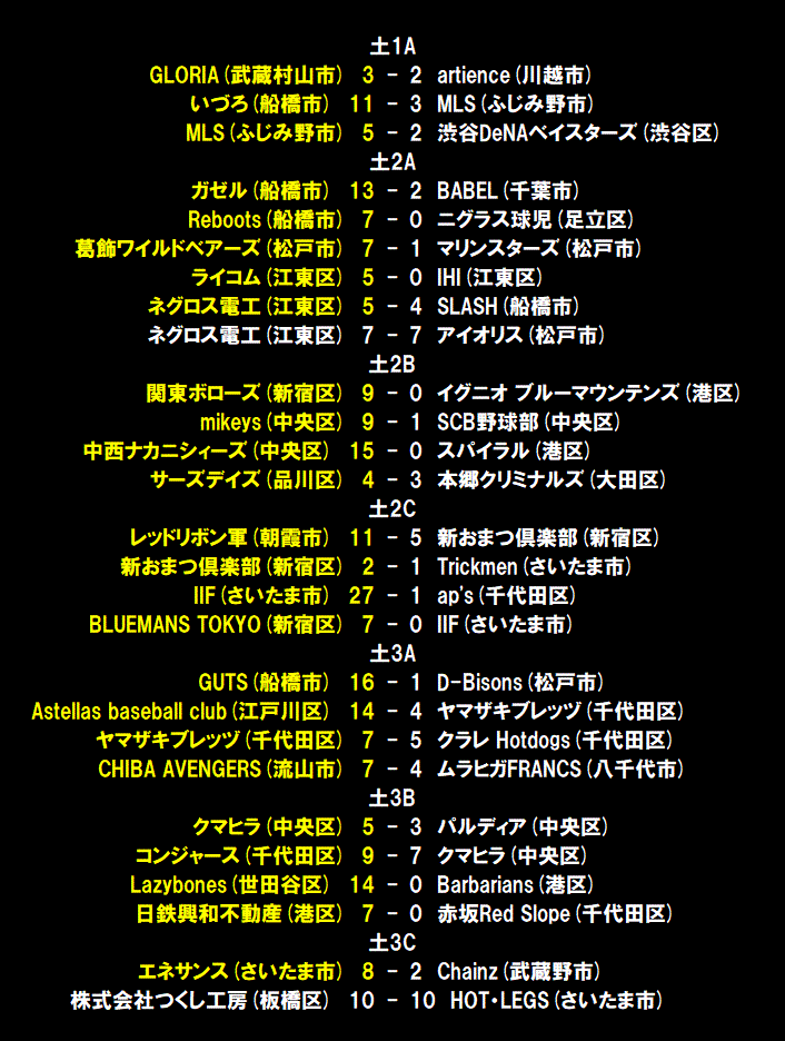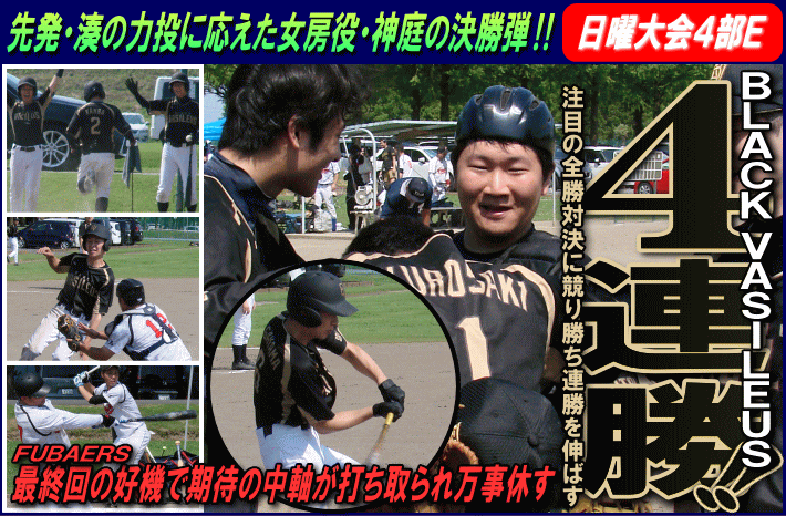 | 互いにここまで3連勝のチーム同士の注目の一戦はBLACK VASILEUSに軍配が上がった。BLACK VASILEUSは2回、死球のランナーを2塁に置き、9番・長山のセンターオーバーのタイムリー2ベースで1点を先制。FUBAERSは直後の3回2死から連打と死球で満塁とすると、4番・村本の放った打球は左中間への飛球。これをレフトがグラブに当てながらも惜しくも捕球できずこの間に2者が生還し、FUBAERSが逆転に成功した。追うBLACK VASILEUSFUBAERSの反撃は4回。1死後、6番・畑中が内野安打で出塁すると、続く7番・神庭(かんば)がカウント2-2からの真っ直ぐをとらえるとこれがレフトオーバーの2ランホームランとなり再びリードを奪った。あとがなくなったFUBAERSも最終回、この回先頭の2番・中村がセンター前ヒットで出塁すると3番・園部も四球で続き無死1・2塁と最後のチャンスを作る。しかし期待の中軸がBLACK VASILEUSの先発・湊の前に相次ぎ打ち取られゲームセット。BLACK VASILEUSFUBAERSが競り勝った。 |