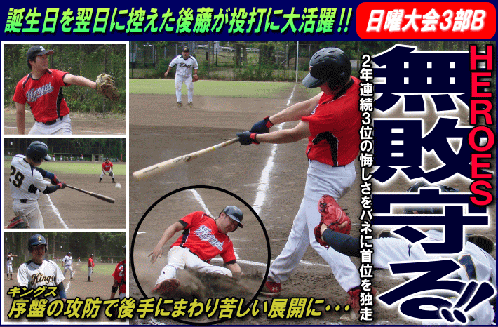| HEROESは初回2死から3番・斉がヒットで出塁すると、続く4番・高嶺がレフトオーバーのタイムリー2ベースを放ちまず1点。さらに5番・馬場も右中間へのタイムリー2ベースで続きその後エラーでもう1点を加え、見事な3連打で3点を先制した。一方のキングスもその裏すぐさま反撃。ヒットで出たランナーを2塁に置き、4番・宮崎のレフトオーバーのタイムリー2ベースで1点を返す。追い上げられたHEROESは直後の2回に突き放す。1番・杉山の右中間へのタイムリー2ベースで追加点を挙げると、5回には2番・後藤のタイムリーで加点し、5-1とリードを広げる。粘るキングスも最終回に連打で無死1・2塁のチャンスを作ると、ここで代打・佐藤が右中間へタイムリー2ベースを放ち2点目。なおも無死2・3塁とチャンスは続いたが、ここは誕生日を翌日に控えこの日が28歳のラスト登板となったHEROESの先発・後藤が緩急織り交ぜた巧みなピッチングで後続を打ち取りゲームセット。HEROESが逃げ切った。 |