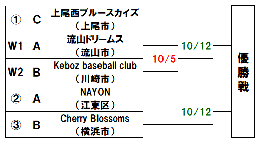 | 近年の関東草野球リーグの覇権を争っている強豪が今年も多くCSに勝ち進んできた。昨年準Vながら総合力の高い上尾西ブルースカイズ(上尾市)が優勝候補の筆頭で、これを昨年関東草野球リーグの頂点に初めて立ったCherry Blossoms(横浜市)が追う展開か。上尾西ブルースカイズは4番・森、5番・関根を中心にどこからでも得点出来る強力打線が今年も健在。守っては主戦大久保ら厚い投手層を誇る。Cherry Blossomsは昨年悲願の頂点に立った。今季はレギュラーシーズンではやや苦しんだ印象もあるが投打に力のある選手が多く残り上尾西ブルースカイズを追う1番手であることは間違いない。面白いのはワイルドカードで出場のKeboz baseball club(川崎市)。レギュラーシーズンでは同組のCherry Blossomsに快勝しており4番・田畑が中心の打線は切れ目がない。初戦で対戦する唯一のCS初出場で堅守の流山ドリームス(流山市)戦をうまく乗り切れば、勢いのついた状態で上尾西ブルースカイズ戦を迎えられる。NAYON(江東区)はCherry Blossomsと2年連続して初戦で激突。3年連続CS進出と今や優勝争いの常連としてリーグに君臨している。大会屈指のリードオフマン・小暮を中心に昨年0-2で敗れたCherry Blossomsにリベンジを果たし2年ぶりのプロスタ進出を狙う。 |