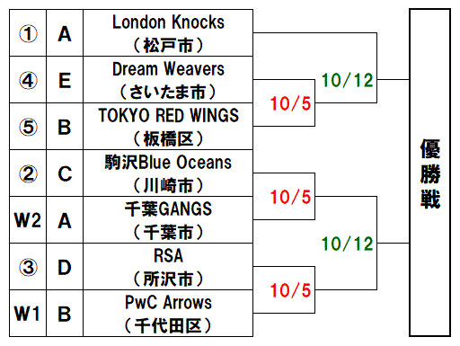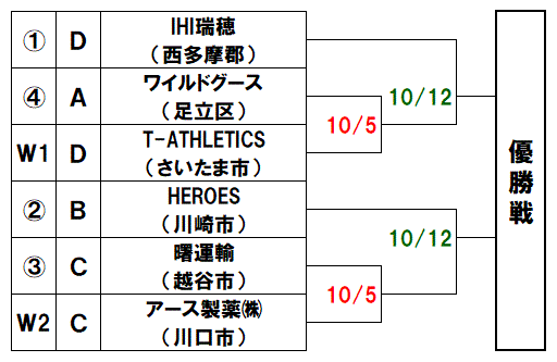 | 昨年5部でCSに出場したLondon Knocks(松戸市)を中心とした優勝争いになりそうだ。London Knocksはチーム2冠王の大橋という屈指の強打者がいる。 投手陣も粒ぞろいで強力な陣容を誇る。Dream Weavers(さいたま市)はエース村井が投打に活躍し結成1年のチームをCSに導いた。勝負強いTOKYO RED WINGS(板橋区)との1回戦は好カードだ。下段は安定したエース・上間がいる駒沢Blue Oceans(川崎市)が一歩リード。初戦で当たるメンバー全員25歳以下と若い千葉GANGS(千葉市)は勢いに乗るとおもしろい。PwC Arrows(千代田区)は1番・井澤は俊足で長打も打てるリードオフマン。守っては東野から淀川、佐藤(春)と繋ぐ継投で勝ち上がってきた。対するRSA(所沢市)は3年前に競り合いの連続だったCSを勝ち切りプロスタにたどり着いた。その経験は相手チームにとっては脅威だ 。 |