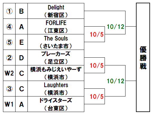 | 上段は総合力でDelight(新宿区)がリードしている。絶対的エース・石川は失点を計算でき、打線も土江・本田・飯田で組むクリーンアップを中心に力のある打者が揃う。対抗はレギュラーシーズンで1試合平均8得点を挙げた強打のFORLIFE(江東区)で、得意の打ち合いに持ち込みたい。The Souls(さいたま市)は経験値の高い40代のバッテリーを擁する。ベテランのインサイドワークで失点を防ぎ、自分たちのペースに持ち込みたい。下段は激戦区。打力と機動力を兼ね備えるブレーカーズ(足立区)がわずかに優位だが、実力差は紙一重だ。まずは好リードオフマン・伊能が楽しみな横浜もみじえいやーず(横浜市)がぶつかる。強打の3番・佐藤を中心に2年連続でCS出場のLaughters(横浜市)はリーグ戦参加25年の大ベテランチーム、ドライスターズ(台東区)と対戦する。Laughtersは昨年あと1勝で逃した夢舞台へ、意識も高い。ドライスターズはプロスタを決めれば実に14年ぶり2度目となり、夏の甲子園ばりの劇的な展開が待っている。 |