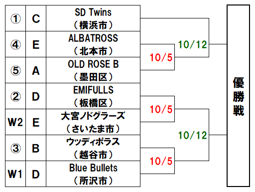 | 今年も戦力的に突出したチームはなく、例年同様の混戦模様だ。上段はどのチームが勝ち上がっても不思議はないが、レギュラーシーズンの戦いぶりから見るとOLD ROSE B(墨田区)が最有力となりそうだ。大きいのは全員打ちを採用する試合も多いなど、チーム全員で勝利に向かっている姿勢だ。沼田・森田らの投手陣も安定感がありCSを勝ち抜く可能性も高いだろう。対抗になるのはSD Twins(横浜市)か。大砲はいないがチームのスローガンである「基本の徹底」が部員全員に周知されスキが少ない印象だ。ALBATROSS(北本市)はレギュラーシーズン最終戦で逆転優勝を決めCS出場権を勝ち取った。台風の目になれるか。下段は飛びぬけたチームは不在という印象だが、打線が活発なEMIFULLS(板橋区)が勝ち上がると予想する。EMIFULLSは須藤・長野・津山ら長打力がある打者が揃っておりどこからでも本塁打が飛び出す。投手陣も粘り強い投球でレギュラーシーズンを全勝で通過するなど総合力は高い。対抗として面白いのはウッディポラス(越谷市)だ。幅広い年齢層のチーム構成だが、世代を超えて力のある打者が多く打ち勝ってきた。攻守の要である成田を中心に悲願のプロスタを狙えるだけの戦力は揃っている印象だ。Blue Bullets(所沢市)はベテランエース・宮井の粘りの投球に期待。大宮ノドグラーズ(さいたま市)は集中打が飛び出す打線に破壊力がある。 |